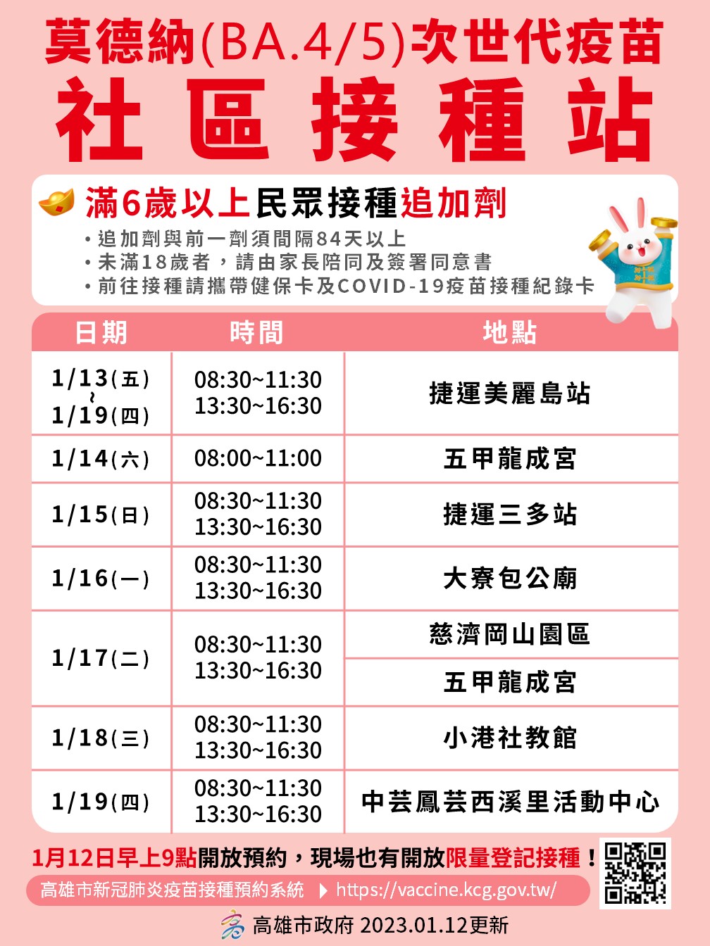 國人尾牙聚餐及春節前返鄉人流遷徙也進入高峰,社區流行疫情風險漸增,衛生局於1月13日至1月19日間加開捷運美麗島站、慈濟岡山園區、五甲龍成宮、大寮包公廟、社教館、林園西溪里活動中心等13站次的接種站,提供次世代BA.4/5雙價疫苗接種服務。滿6歲以上民眾,只要與前一劑接種間隔滿84天以上即可接種追加劑,並請攜帶健保卡及黃卡到場,欲接種者可上高雄市新冠肺炎疫苗接種預約系統預約 https://vaccine.kcg.gov.tw/ ,也可透過高雄市COVID-19疫苗合約院所查詢系統 https://vaccine-query.kchb.gov.tw 查詢各類疫苗接種資訊(含兒童及嬰幼兒),就近選擇合約院所電洽預約。