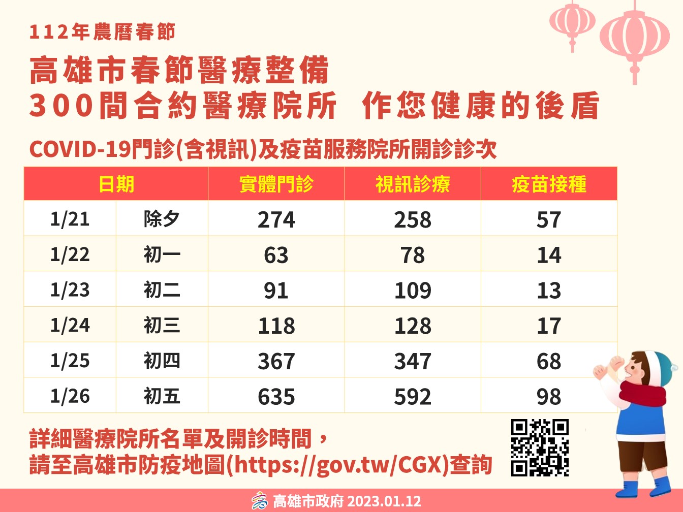 (記者吳冠賢\高雄報導)農曆春節期間為持續提供市民朋友醫療服務,本市25家醫院於今年1/21(除夕)至1/25(初四)增設「急性呼吸道疾病專診」;300家以上醫療院所提供COVID-19門診(含視訊)、口服抗病毒藥物開立及COVID-19疫苗接種。醫療院所名單及開診時段,可上高雄市政府全球資訊網站新冠肺炎居家照護及疫情專區( https://gov.tw/NXg )查詢。另為便利民眾就近就醫,高雄市防疫地圖( https://gov.tw/CGX )也已加入過年期間看診資訊整合,衛生局持續盤點醫療量能及防疫醫療物資充足,請市民朋友安心。
