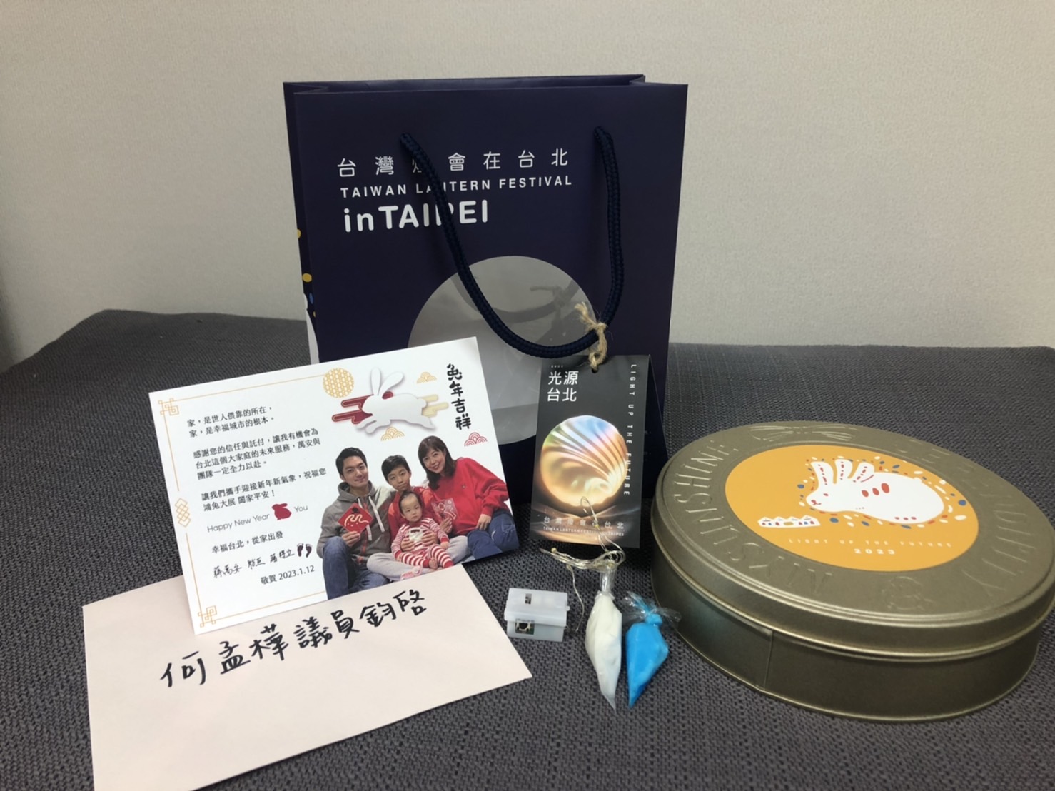民進黨台北市議員何孟樺透過臉書表示,台北市府秘書處送「台灣燈會邀請函」,但發現提袋外頭印有燈會主視覺,內有餅乾、餅乾糖漿、小燈球等,卻完全沒有台灣燈會相關資訊,只有一張印上台北市長蔣萬安全家福的新年賀卡。