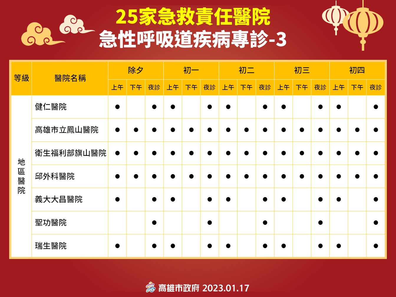 市長陳其邁表示,面對Covid-19疫情,醫護防疫人員已連續三年犧牲與家人團聚的時光,堅守第一線崗位捍衛市民健康。隨邊境解封,面對國際疫情與可能攀升的流感趨勢,醫療整備工作更不可輕忽,除代表市民朋友對醫護致上衷心感謝,高市府並將發給春節連假期間「急性呼吸道疾病專診」醫護人員每人每班2,000元、同期間值勤的防疫人員,也發給每人每班1,000元春節慰問金,感謝有您!
