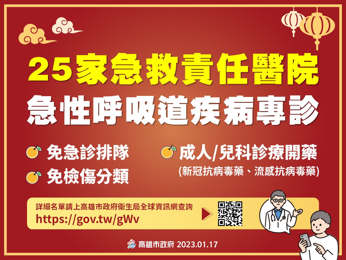 為讓民眾春節連假期間就醫更便利,並分流急性上呼吸道就醫者避免造成急診雍塞、排擠急重症醫療,高雄市政府針對農曆春節連假期間已完成醫療整備,除300間合約診所提供快篩判陽、視訊看診、給藥服務外,衛生局並責成25家急救責任醫院,開設呼吸道專診,並要求備妥市立聯合醫院、民生醫院及凱旋醫院擴增專責病房200床、所屬醫療團隊24小時待命,以因應防疫醫療之需。