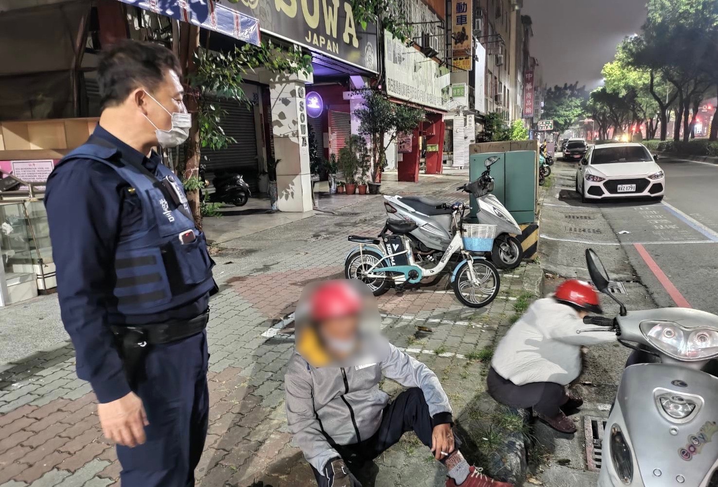 三民第一分局十全所員警謝志玄於1月18日4時執行巡邏勤務行經三民區民族一路時,發現兩名頭戴紅色安全帽林翁(70歲)及陳婦(67歲)蹲坐在路邊,下車查看發現林翁雙腿遭機車壓住,趕緊上前協助將機車扶正,所幸他僅有輕微擦傷無大礙;一旁陳婦因寒流來襲身體顫抖不停,根本無力協助先生,警方及時到來救援,才化解一場危機。