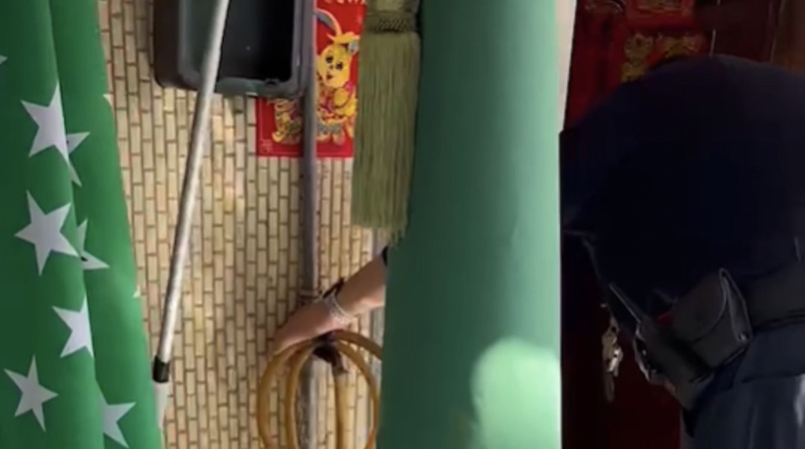 所長陳宗靖獲報後率警員呂子涵、鄭又仁立即趕到現場,警方到場安撫二人情緒,發現原來是鄰居吳男家的水龍頭壞了,警員鄭又仁立即觀察管線走向後方見到損壞的水龍頭,再沿著水管找到水箱,將水箱內閥門用工具關閉,流水的情形就消失了…不費吹灰之力、整個過程不到30秒。