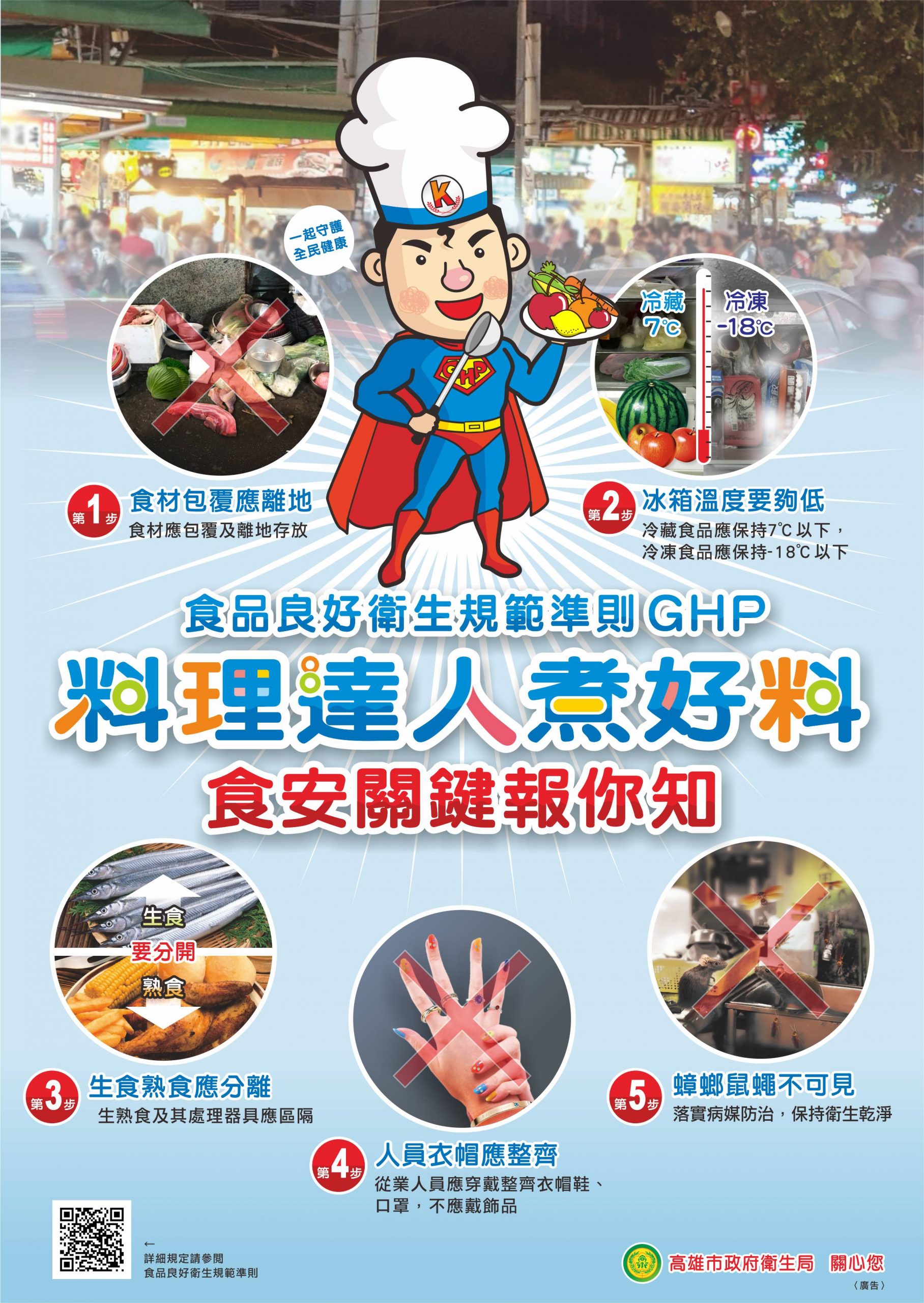 衛生局提醒民眾及業者預防食品中毒五要原則,讓大家吃得安心又健康:一. 要洗手:調理食品前後需澈底洗淨雙手,有傷口要包紮。二. 要新鮮:食材要新鮮,用水要衛生。三. 要生熟食分開:處理生熟食需使用不同器具,避免交叉污染。四. 要澈底加熱:食品中心溫度超過70℃,細菌才容易被消滅。五. 要注意保存溫度:保存低於7℃,室溫不宜放置過久。