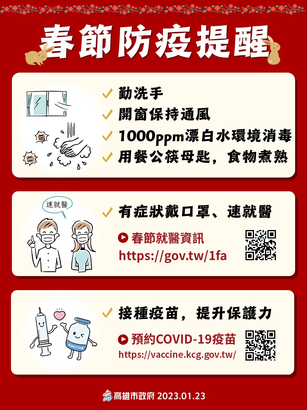 衛生局呼籲除了防範病毒性腸胃炎,目前新冠肺炎也是防疫重點之一,接種新冠肺炎疫苗仍是目前最有效的防治策略,衛生局於1/25(初四)至1/28(初七)開設捷運美麗島站,提供次世代BA.4/5雙價疫苗接種服務。滿6歲以上民眾,只要與前一劑接種間隔滿84天以上即可接種追加劑,並請攜帶健保卡及黃卡到場,欲接種者可上高雄市新冠肺炎疫苗接種預約系統預約 https://vaccine.kcg.gov.tw/ ,也可透過高雄市COVID-19疫苗合約院所查詢系統 https://vaccine-query.kchb.gov.tw 查詢各類疫苗接種資訊(含兒童及嬰幼兒),就近選擇合約院所電洽預約。
