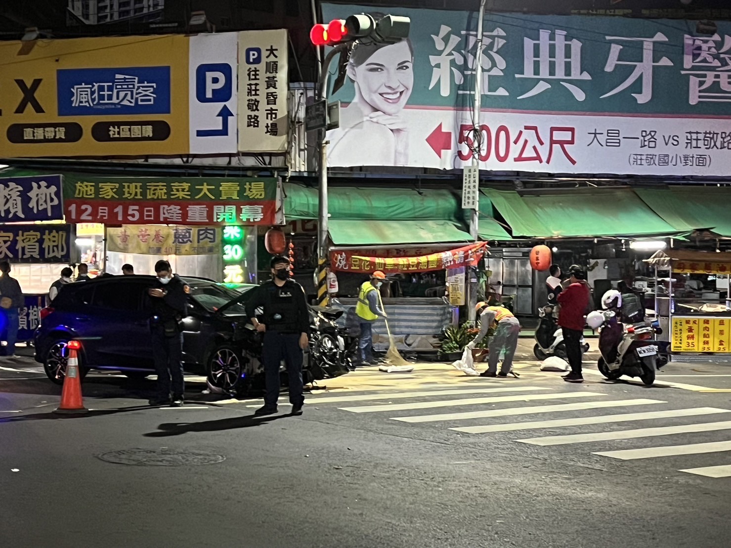 (記者謝富益\高雄報導)今(6)日凌晨高雄市三民區大順二路與莊敬路口發生一起交通事故,26歲自小客車劉姓男駕駛由大順二路東向西左轉向南往莊敬路,與22歲自小客車吳姓男駕駛由大順二路西向東直行駛發生碰撞,波及停等紅綠燈之重機車23歲林姓女騎士,經送醫後無生命危險。