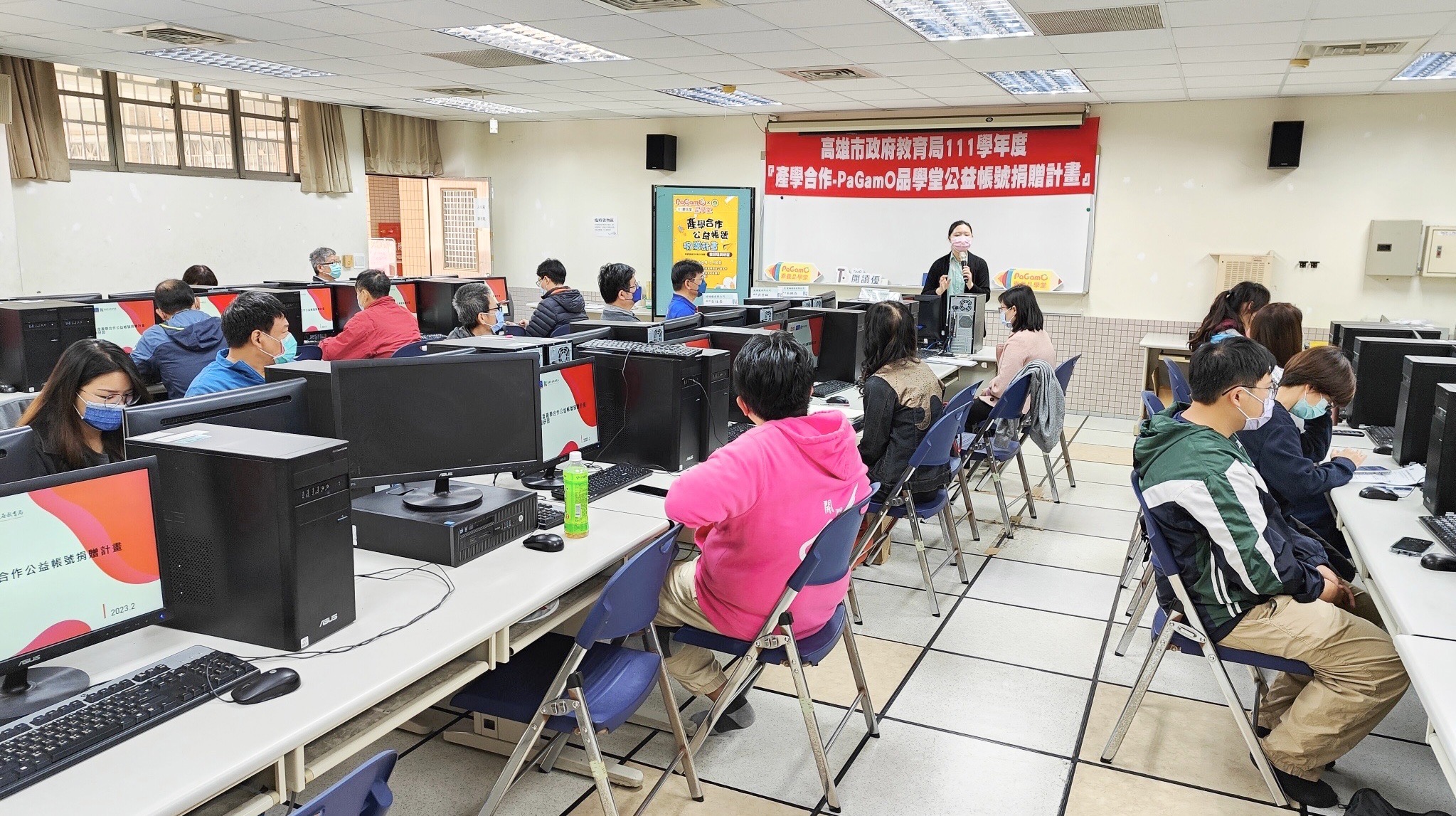教育局現場也同步舉行產學合作公益帳號—師力培訓研習,培訓捐贈帳號學校教師熟悉系統操作,讓公益帳號發揮最大效益。現場也展示捐贈帳號「PaGamO素養品學堂」數位學習平臺,讓教師實際操作與練習,瞭解平台提供學習的趣味性與效益。