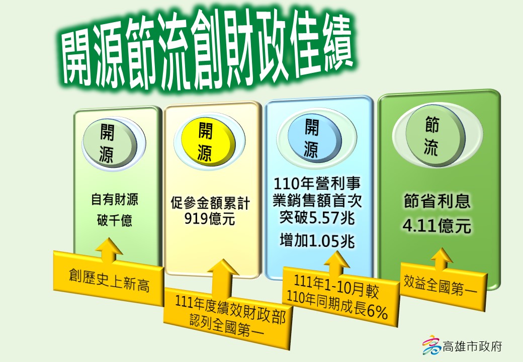 市長上任後,積極推動開源,透過促參及招商引資,帶動城市經濟繁榮,挹注市庫收入成長,使本市自有財源由100年699億元,於111年首度突破千億(1,002億),112年更達到1,100億元,創歷史新高。