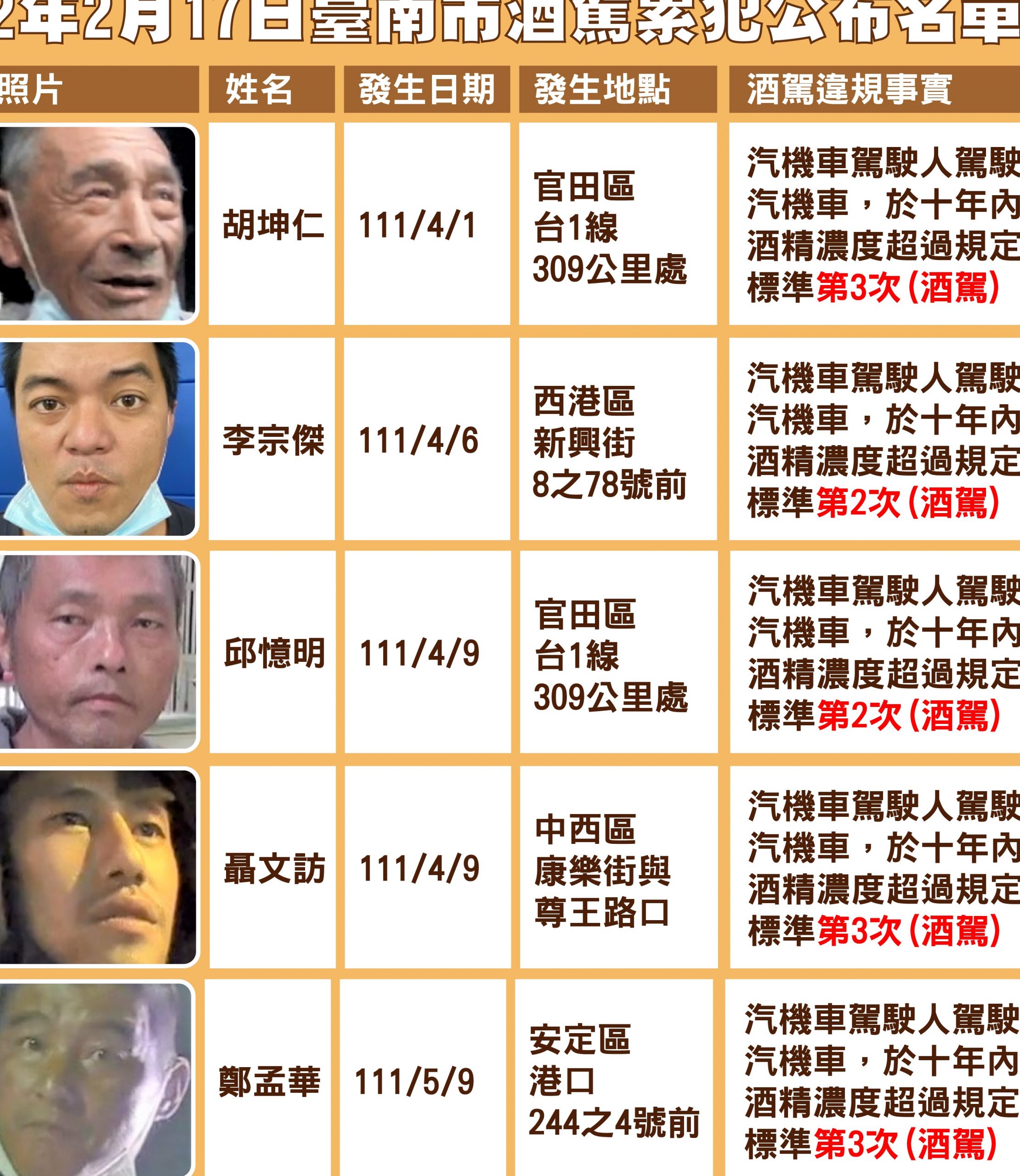 (記者黃文博/台南報導)台南市公布第19批酒(毒)駕累犯名單,本次公布10名累犯違規人,累計公布140人。本次公布違規地點分別在官田區2名、西港區1名、中西區2名、安定區1名、東區2名、下營區1名、善化區1名,交通局依法公布姓名、照片及違法事實等資訊。