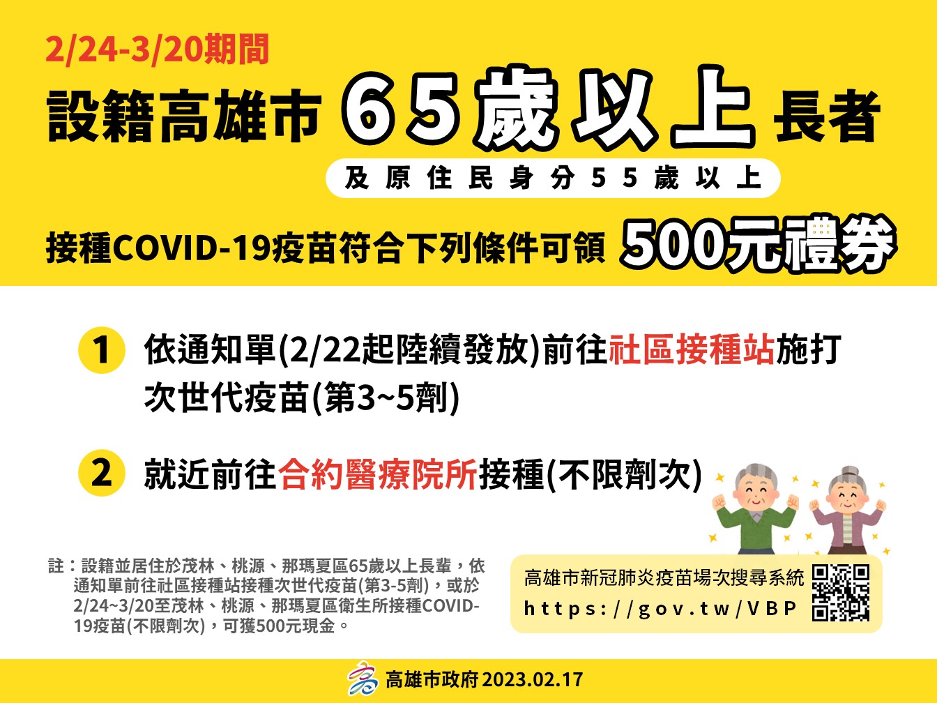 指揮官陳其邁市長提醒市民朋友,因應疫情社區化、流感化,須更關注「未接種COVID-19疫苗滿3劑以上」或「未接種BA.4/BA.5次世代疫苗追加劑」的高風險脆弱族群重症及死亡風險。市府已規劃針對未接種次世代疫苗(第3-5劑)之65歲以上長輩發放通知單,安排前往社區接種站施打疫苗。設籍本市65歲以上長者(原住民55歲以上)於2/24-3/20於社區接種站或合約醫療院所完成接種疫苗,不分劑次皆獎勵500元禮券(原民區獎勵500元現金)。