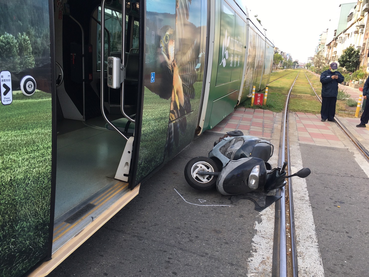 葉姓男子(53歲)騎乘機車行駛鼓山二路(南往北),在北斗街口右轉,未注意輕軌號誌,與北向行進中的輕軌左側車廂發生擦撞,葉男人車倒地,左腳疑似遭自己機車壓傷,由救護車送醫診治,意識清楚,無生命危險。