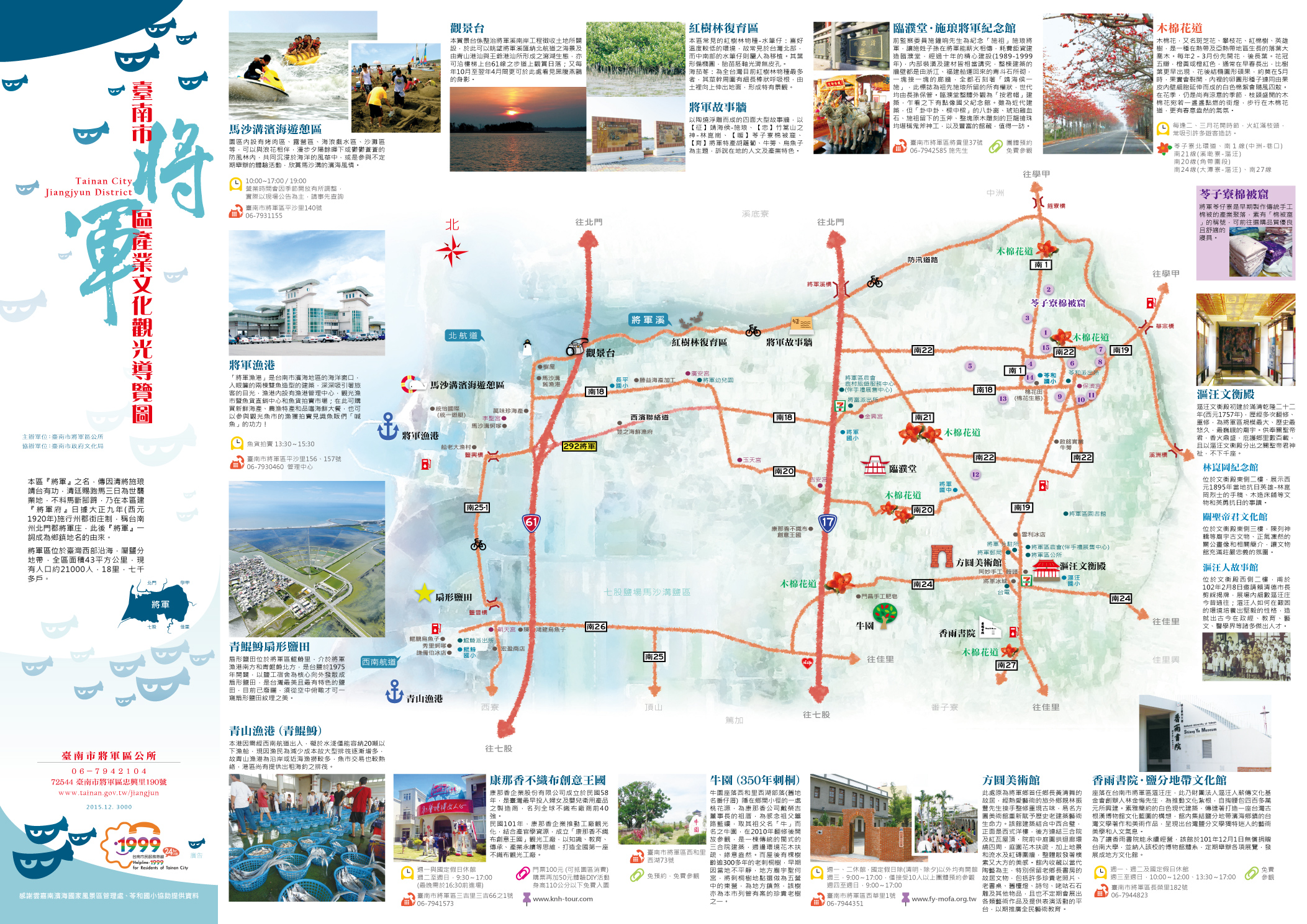 觀光旅遊局代理局長林國華說,將軍的木棉花道美景和白河林初埤木棉花道不分軒輊,其中南21線的漚汪木棉花道最長近2公里,花開茂密;南20線角帶圍東段、苓仔竂北環道的鄉間小路,在兩旁的綠色農田襯托下,橘色隧道更顯鮮麗。每條木棉花道都各有特色,一定能滿足不同的賞景拍照需求。