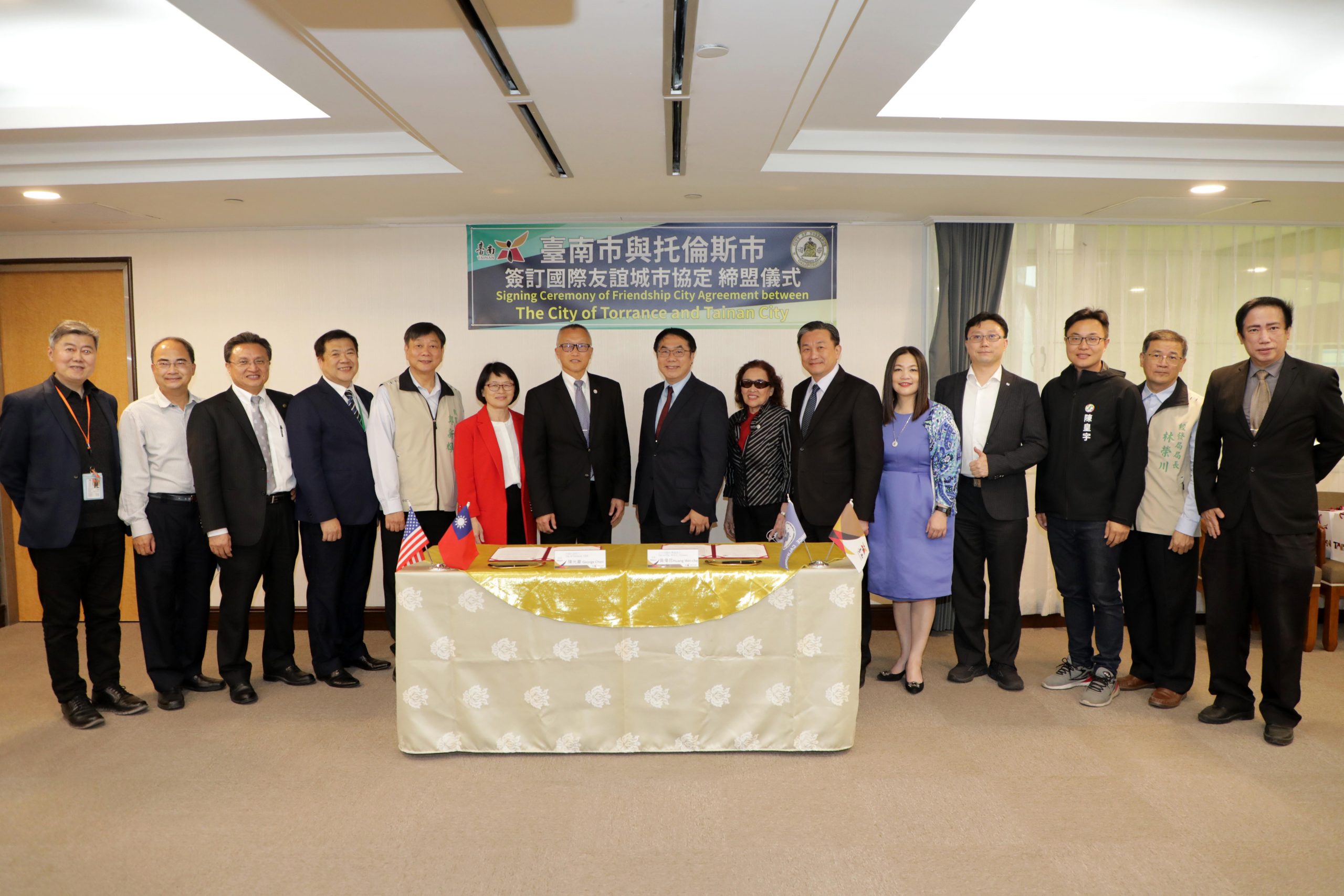 (記者黃文博/台南報導)台南市長黃偉哲13日與美國加州托倫斯市陳光豪市長(George K. Chen)簽署國際友誼城市協定,未來兩市可望開展在產業交流、師資交換、選手移地訓練等的合作,南市府方由經發局林榮川局長、教育局鄭新輝局長、新聞處蘇恩恩處長與體育局林義順副局長陪同市長出席接待。