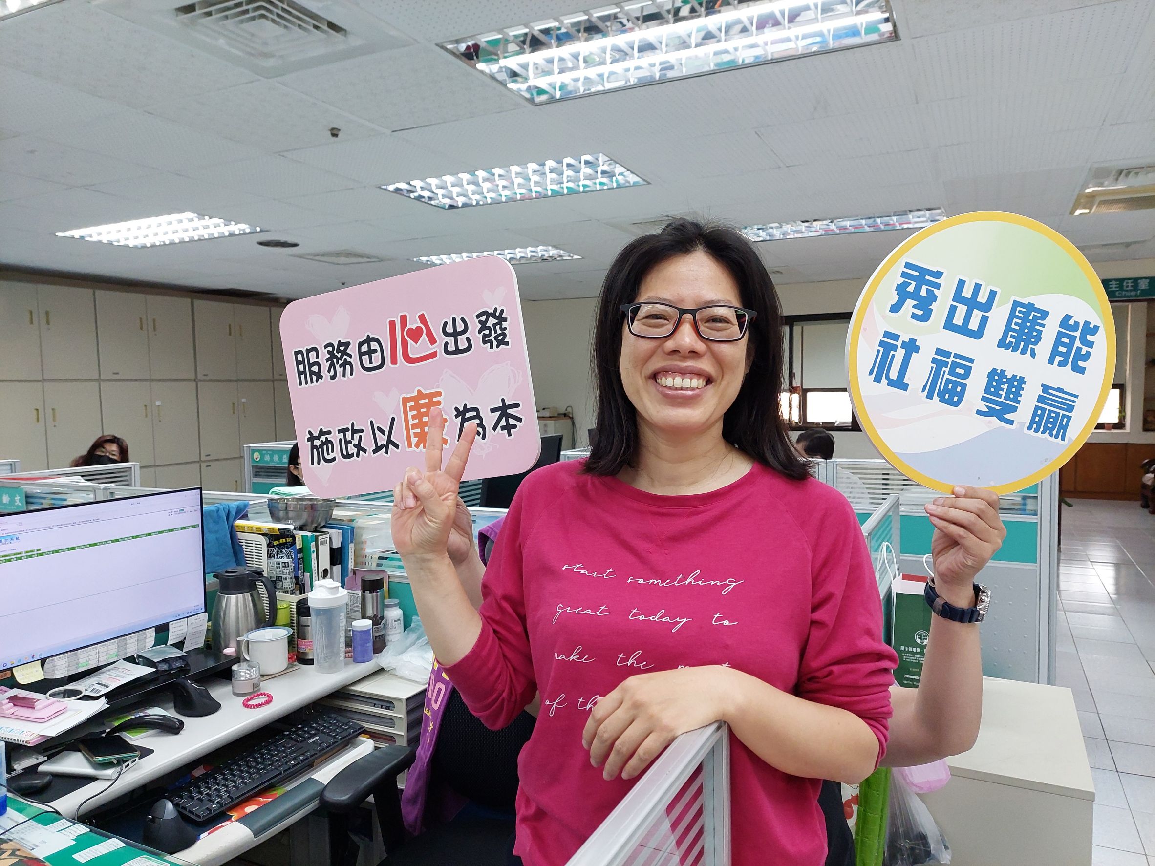 因為廉潔楷模名額有限,難免有遺珠之憾,老人福利科黃于殷承辦中低收入老人特別照顧津貼業務,四處奔波進行個案訪視,並協助轉介居家服務、喘息服務、長照服務、連結食物銀行等,廉潔自持、積極解決民困;長青中心陳欣琪積極佈建社區照顧關懷據點,推動在地安老政策,節省國家醫療資源,同時積極追繳部分受補助單位溢領款項達百萬元,使公帑作更有效益之運用,二人的努力事蹟,實為各界表率。