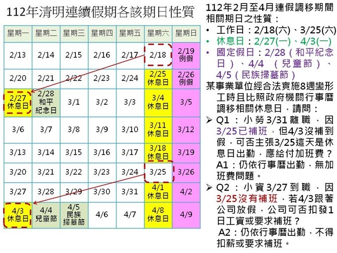 (記者謝富益\高雄報導)112年4月4日(二)及4月5日(三),為兒童節及民族掃墓(清明)節,屬於法定休假日(即俗稱之國定假日),雇主應依法給假,如徵得勞工同意於該日出勤時,工資應依法加倍發給。另依勞基法施行細則第23條之1規定,該休假日如適逢勞工例假或休息日,雇主應補假1日。事業單位如屬週一至週五為工作日、週六為休息日、週日為例假之出勤模式,欲比照政府機關出勤,以形成本次民族掃墓節及兒童節之5天連假,可透過8週彈性工時之實施,將3月25日之原定休息日與4月3日之原定工作日調整互換。