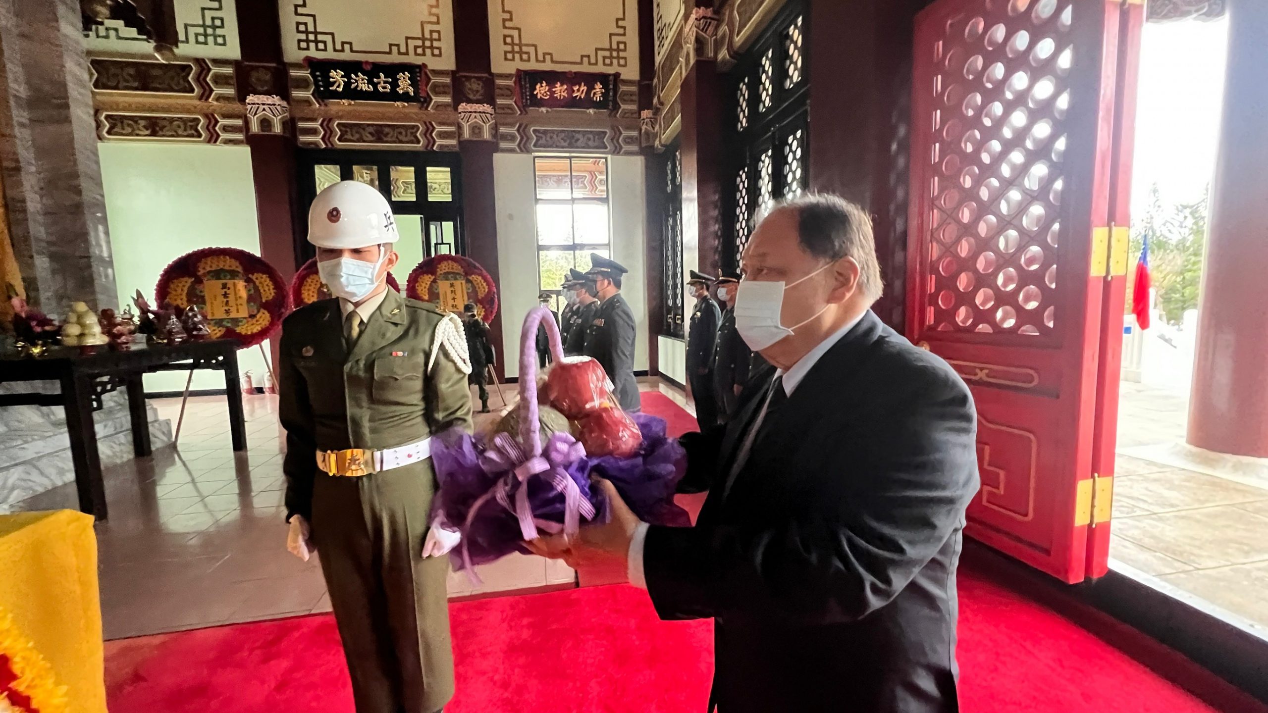 陳光復依循古禮向革命先烈陣亡將士獻花、獻爵、獻果、行三鞠躬禮,表達崇敬追思之意,緬懷其為國捐軀的精神。