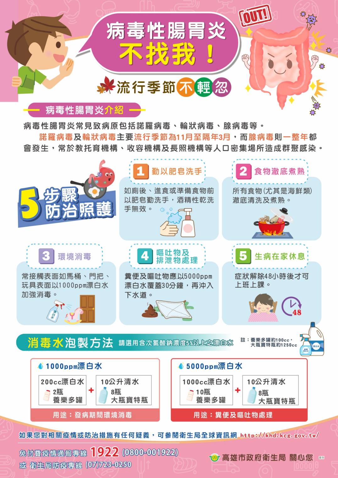 相關資訊可至衛生局全球資訊網(http://khd.kcg.gov.tw)之「病毒性腸胃炎專區」查詢。歡迎民眾上網查詢,亦可撥打轄區衛生所、高雄市政府衛生局防疫專線:07-7230250洽詢。