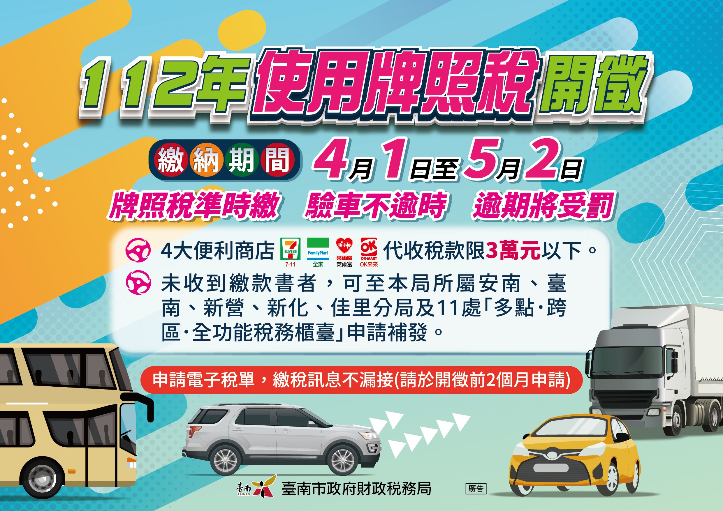 該局提醒民眾,112年使用牌照稅繳納期間自112年4月1日起至5月2日止,只要透過行動支付(遠端)、網路繳稅服務網站、地方稅網路申報作業網站之線上查繳稅等其中一種方式繳納,就可以參加該局抽獎活動拿好康。