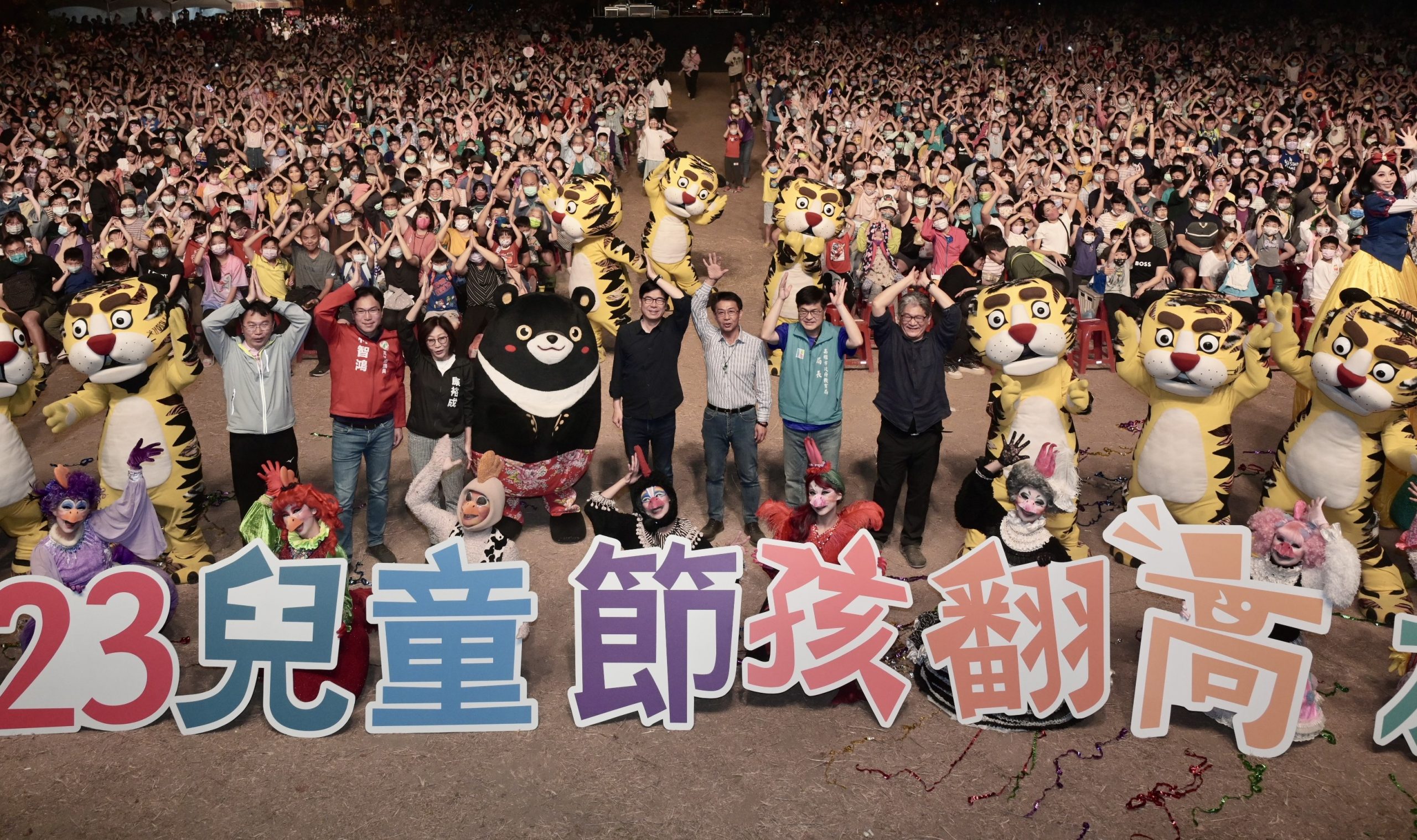(記者黃思慈\高雄報導)為讓大小朋友連假5天「孩翻高雄」,高雄市政府推出兒童節系列活動,紙風車劇團今(3)日傍晚於衛武營都會公園演出「雞城故事」,吸引眾多親子前來觀賞,全場觀眾近一萬人。市長陳其邁也現身舞臺,祝福小朋友兒童節快樂,現場愛虎表演與兒童歌舞音樂劇演出精彩、氣氛歡樂。