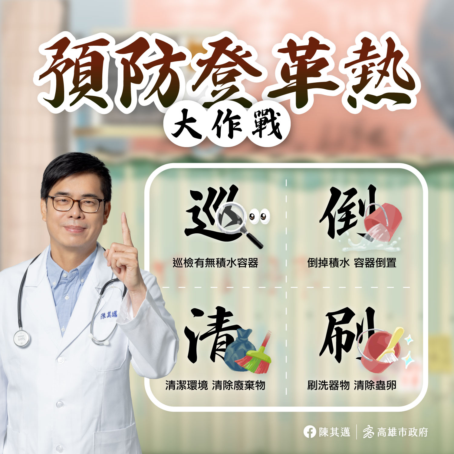 圖說:請市民朋友也要注意家中室內外環境,每週定期落實「巡、倒、清、刷」。(高雄市衛生局提供)