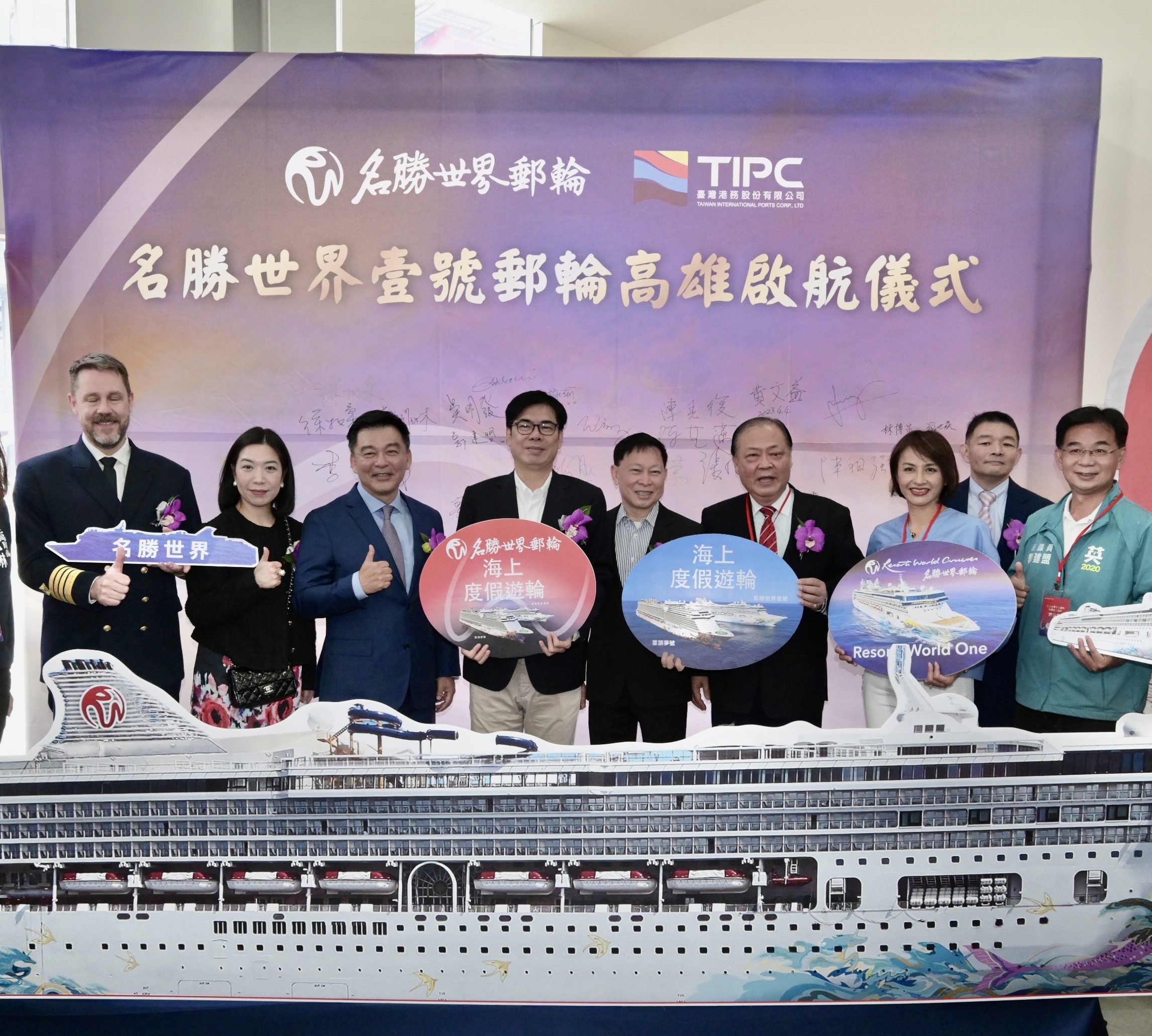 陳其邁表示,名勝世界郵輪發揮「緊緊緊」精神,以最快的時間,從規劃到首航,讓名勝世界壹號郵輪於今日從高雄快樂出航,他感謝海洋局、交通部航港局、臺灣港務股份有限公司等各單位全力配合,並祝福名勝世界壹號郵輪旅客於整個旅遊過程歡喜開心、享受愉快的旅程。