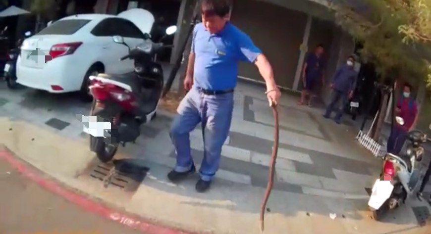 農業局委外捕蜂捉蛇廠商到達現場,打開引擎蓋一度找不到巨蛇躲藏之處,後來靠著員警所配備的手電筒,成功將蛇引出,徒手一抓放入網中,一旁圍觀民眾紛紛驚呼,初步檢視該蛇可能是具有毒性的眼鏡蛇,詳細物種仍要帶回鑑定,幸虧民眾發現得早,警察即時到場管制,才沒有發生民眾被咬傷的情事。