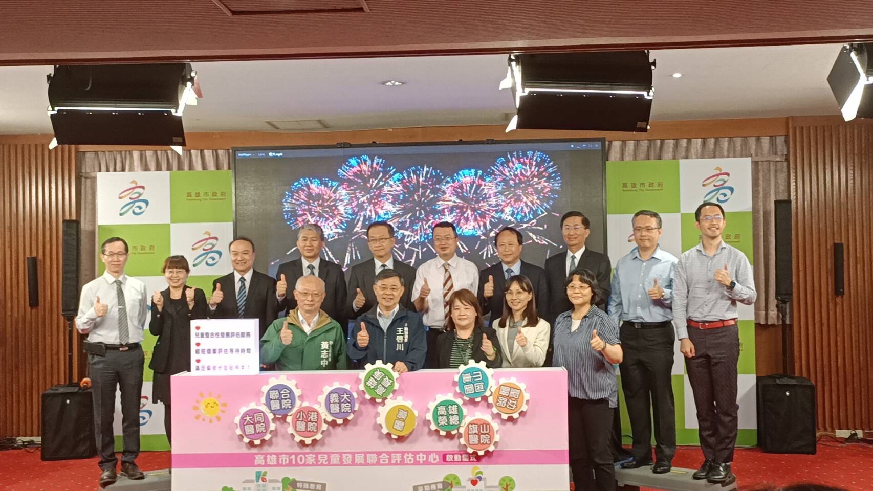 圖說:為向市民宣傳兒童發展聯合評估中心設立,市府、衛生福利部國民健康署長官及10家兒童發展聯合評估中心承辦醫院共同啟動,現場白喬茵議員、湯詠瑜議員、王義雄議員及多位議員服務處代表一同支持關心。(高雄市政府衛生局提供)