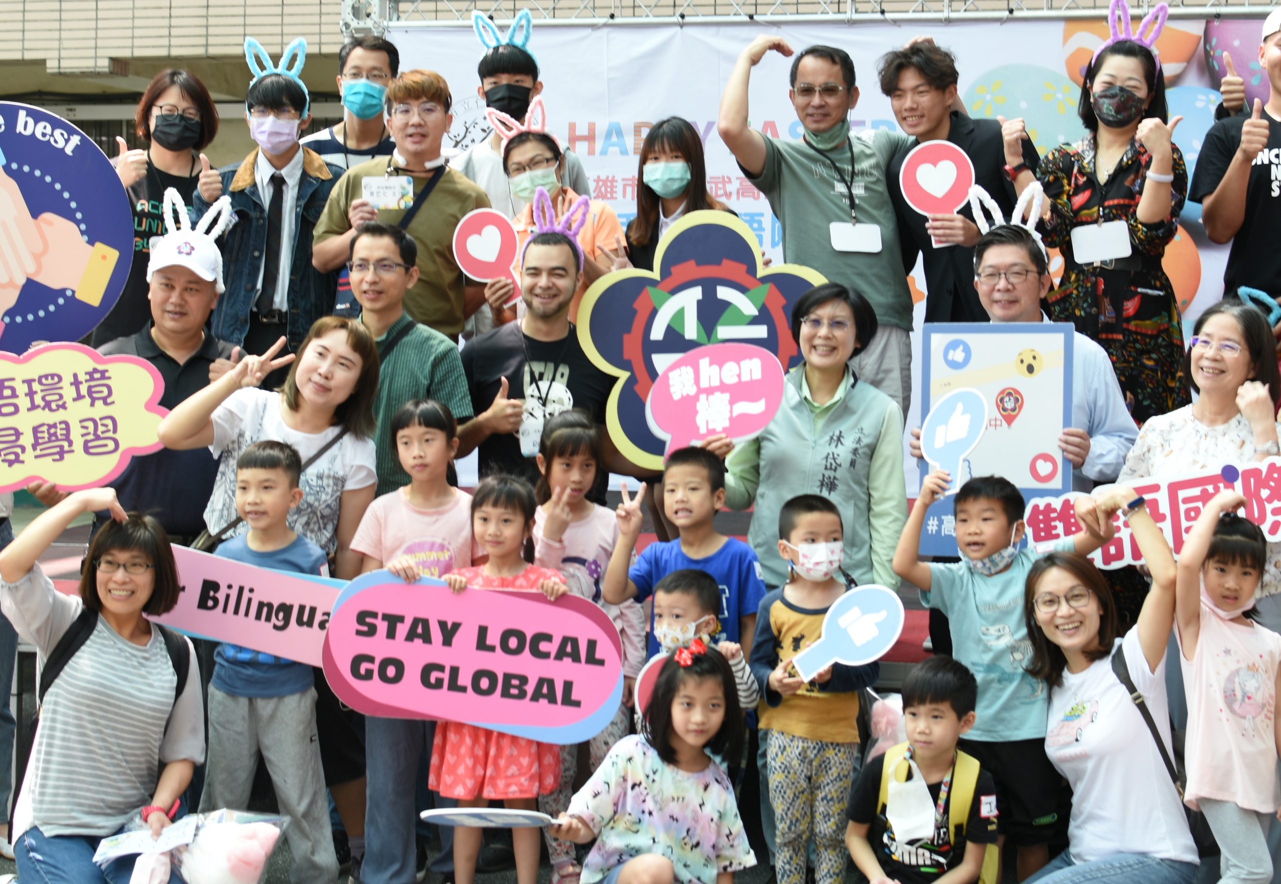 圖說:活動過程以「大手攜小手」一起學習的理念,讓小朋友們在彩蛋尋寶與雙語闖關中快樂學英語。(高雄市政府教育局提供)