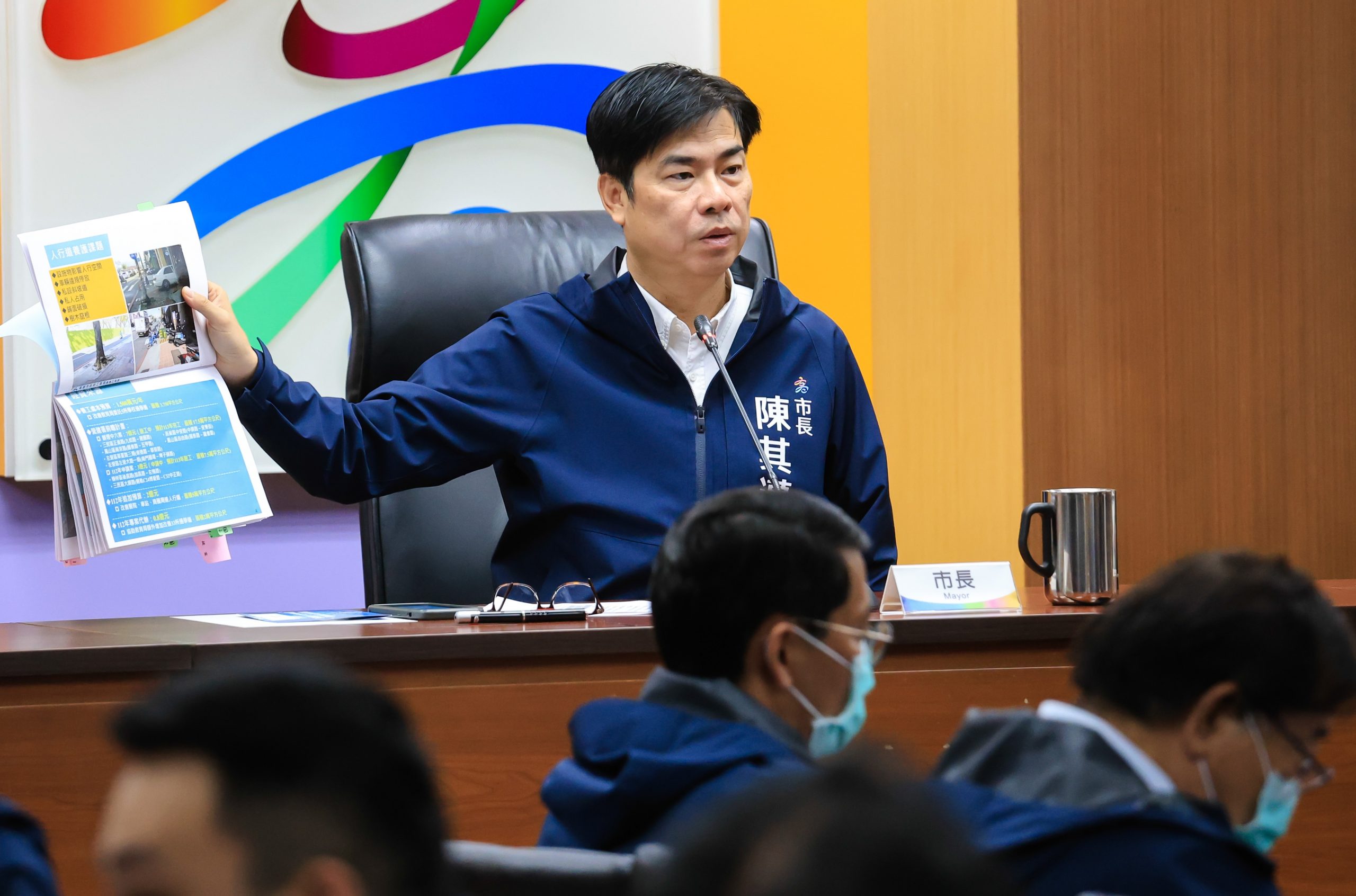 圖說:高雄市長陳其邁主持市政會議時,關心人行道及校園通學道鋪面改善情形。(高雄市政府提供)