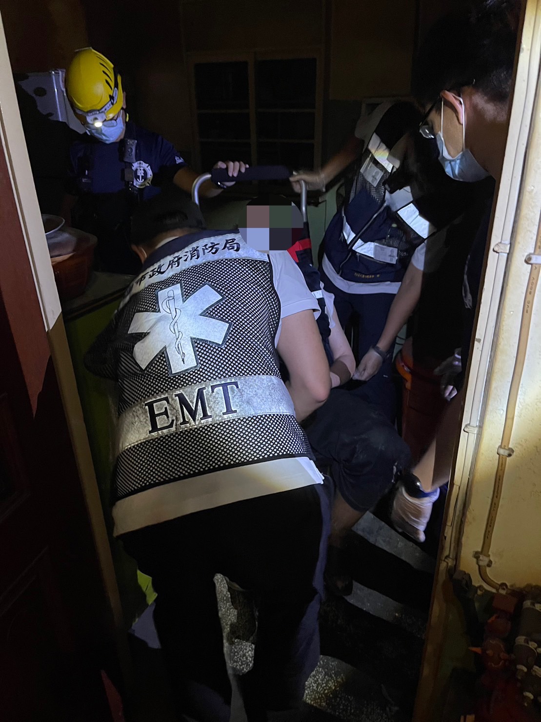 圖說:53歲麻姓男子在住家摔倒喊救命,警方獲報即趕赴現場了解,最後在警消人員及時協助下送往醫院救治。(高雄市鹽埕警分局提供)