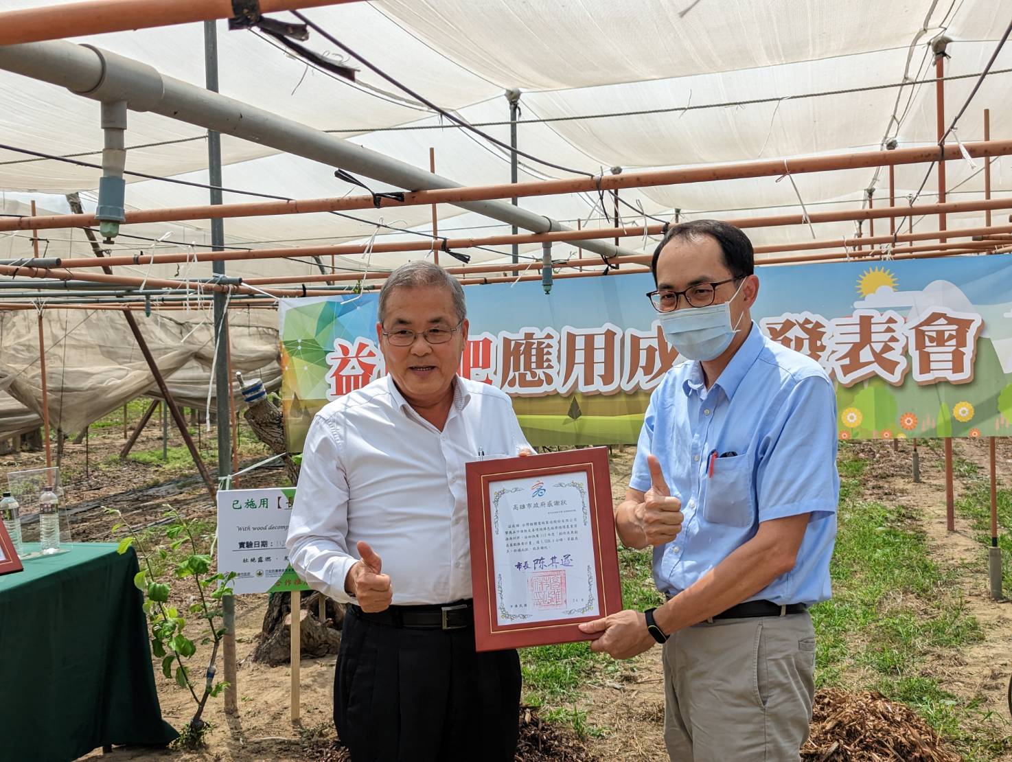 高雄市政府農業局長張清榮在市議員張漢忠、王義雄議員服務處主任蘇經孟與燕巢區農會總幹事吳俊昌的見證下,特別頒贈感謝狀予台積電,感謝台積電捐贈益菌肥嘉惠高雄農友。張清榮說,農業局將持續推廣與輔導農民多加使用益菌肥處理稻草及果樹殘枝,進而「還肥於田」,為淨零排放做好準備,也期待未來有更多企業一起加入,重視環境永續議題,共同為農業的永續發展努力。