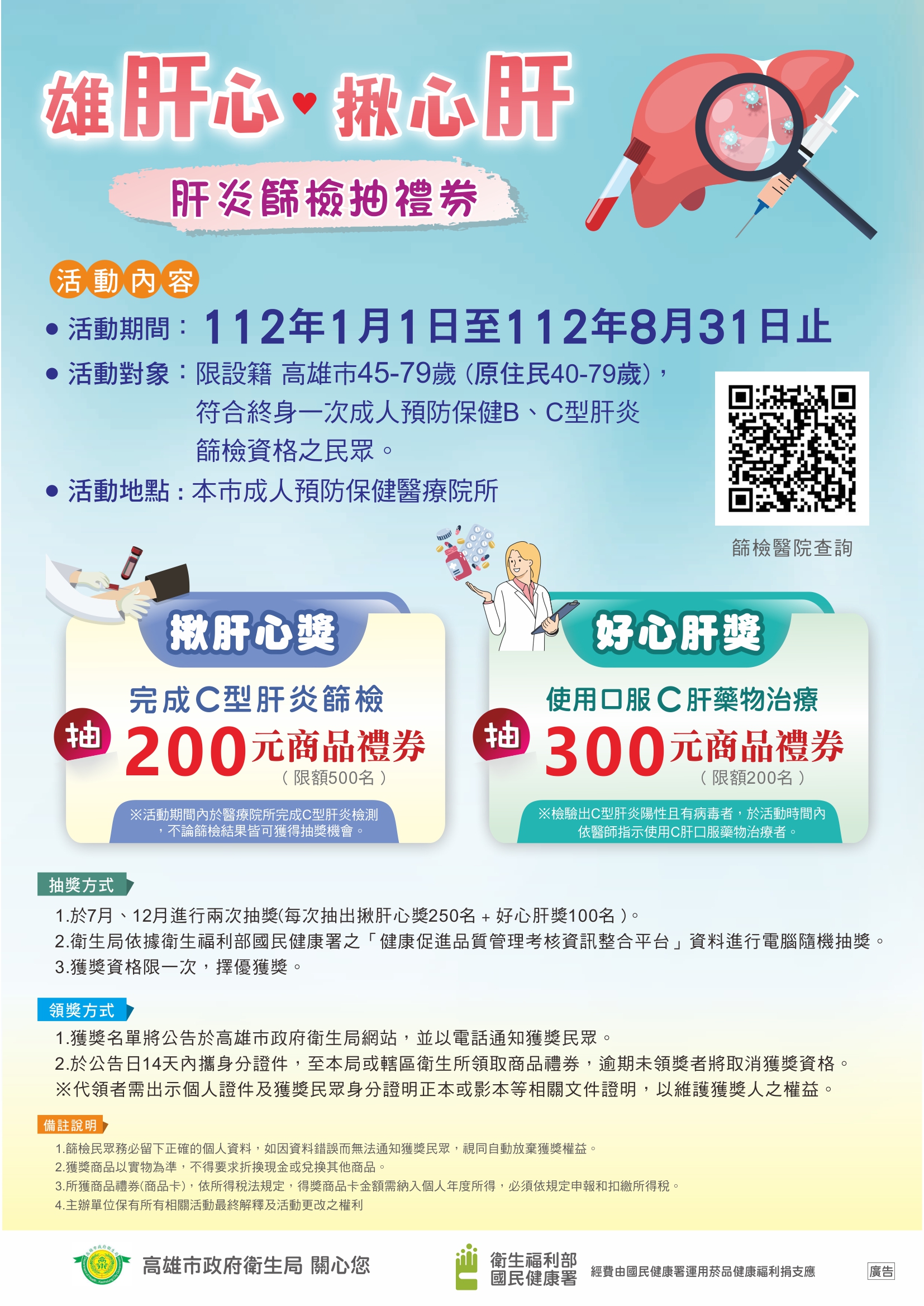 (記者吳冠賢報導)高雄市政府衛生局關心您肝臟的健康,特別舉辦「雄肝心,揪心肝」肝炎篩檢抽禮券活動 ,從今年1月1日起至8月31日止,凡設籍高雄市45-79歲未做過B、C型肝炎篩檢之民眾,於活動期間內完成篩檢者,將抽出500名幸運兒,獲得200元商品禮券;如若檢驗出C型肝炎陽性且有病毒、於活動時間內依醫師指示使用C肝口服藥物治療者,將抽出200名幸運兒,獲得300元的商品禮券。歡迎市民朋友「樓上揪樓下,大家作伙來顧肝」,不但能得到健康還有機會獲得禮券。