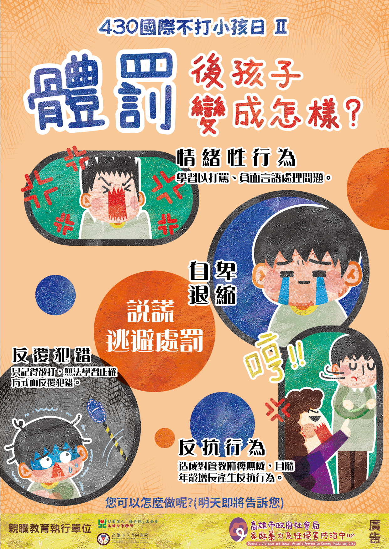 社會局家防中心蒐集親職教育輔導的實務經驗,透過簡單易懂的圖卡,讓家長瞭解為什麼會選擇體罰管教孩子?體罰後孩子會變成怎樣?不打孩子,可以怎麼做?所有圖卡資訊放於高雄市社會局家防中心的官網(https://safesex.kcg.gov.tw/)及「高雄家暴中心」粉絲專頁,歡迎市民了解及分享給有需要的家庭。