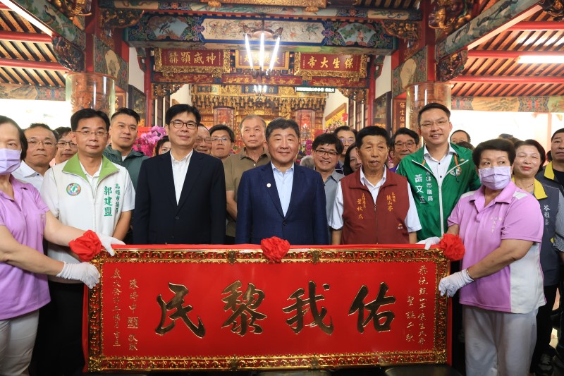 圖說:高雄市長陳其邁今(4)日上午偕同前衛福部長陳時中前往苓雅鼓山亭,為保生大帝聖誕揭匾。(高雄市政府提供)