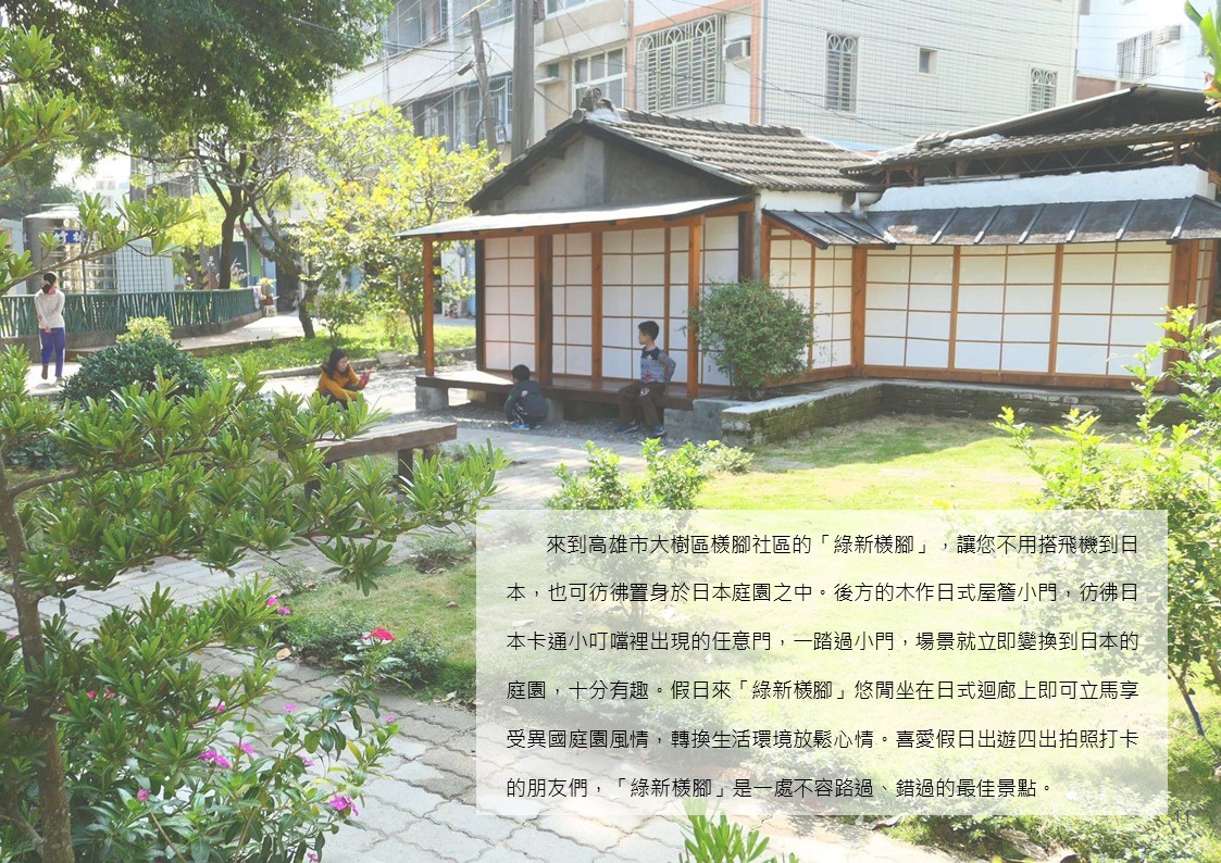 大樹檨腳社區發展協會林秋梅里事長特別感謝都發局的輔導,透過社區營造補助計畫,讓社區發揮創意,將廢棄宿舍建材回收再利用,把日式建築與庭園氛圍營造回來,現今這片綠地已從髒亂點成為社區鄰里聚集乘涼、聊天的好去處,也成為大樹國小學童及家長安全的接送停等空間,喜愛假日出遊拍照打卡的朋友,「綠新檨腳」是不可錯過的最佳景點。