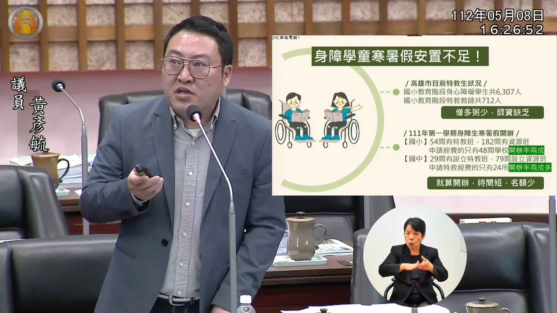 黃彥毓議員質詢指出,近日接獲20幾位身障學生家長集體陳情,表示高雄市目前多數學校寒假不提供課輔,而暑假就算有開辦,為期也不到兩個月。家長們表示身障孩子不像一班生課後可至坊間安親班收托,必須就讀特教學校及集中是特教班,在教育局、社會局配套不完善的情況下,身障童雙薪家庭家中其中一方被迫辭職照顧小孩,但物價上漲,單憑一份薪水無力養家,也難返回職場,希望相關單位可以重視少數學童及家長權益。