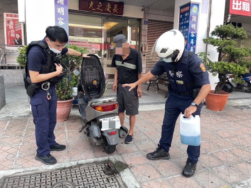 警員班消防科老學長機車油箱見鑿,員警當即自掏腰包採買汽油補添並護送老翁返家。(高雄市三民二警分局提供)