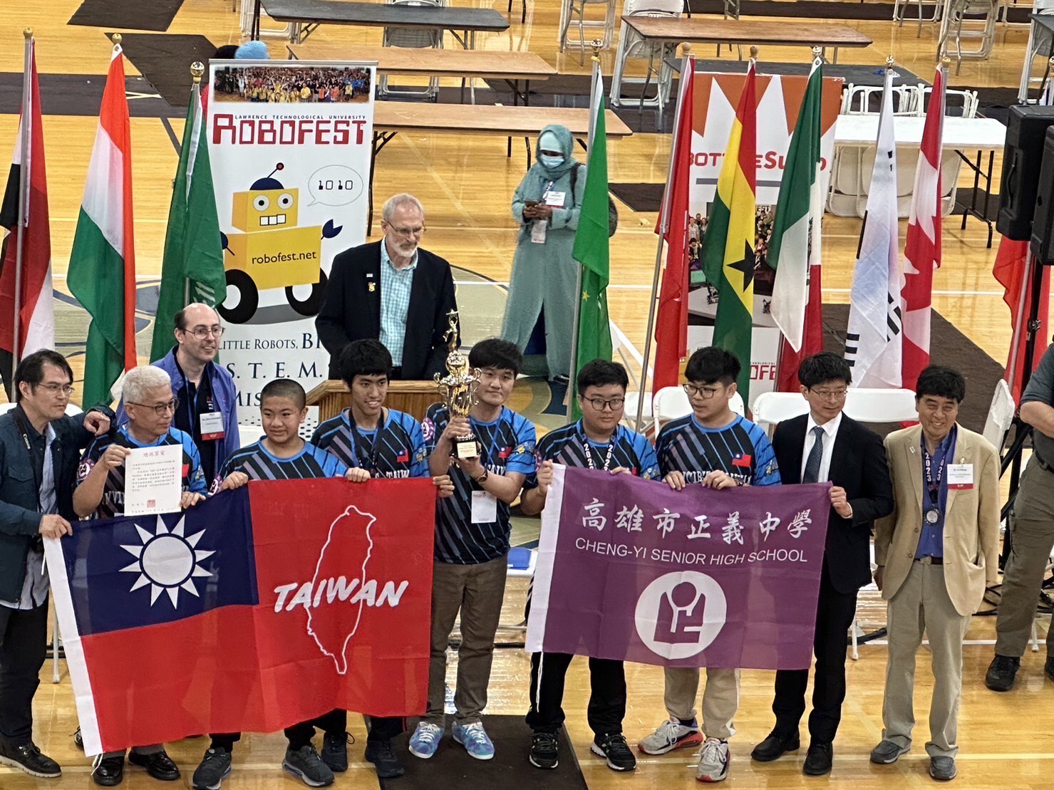 頒獎典禮上中華民國國旗飄揚,台灣因而成為高科技人才搖籃而受到各國代表的關注及致敬,正義中學再次以亮眼成績,為國爭光揚名國際!正義中學與20國好手同台競技,經過3天努力奮戰,高中部學生孫奇霆、陳毅祥、郭靖、佘文喆四人勇奪「GAME主題賽高級組」世界冠軍,同時孫奇霆、佘文喆兩人與章凱昱、吳岱威再聯手拿下「未知任務挑戰賽」季軍;國中部學生陳訢慈、呂安璨、陳廷恩、洪凱鴻、吳峻霆,初生之犢不怕虎,首次參加國際性比賽,就榮獲「GAME主題賽初級組」世界第四名,實屬難得。不但讓世界認識台灣,同時駐芝加哥辦事處並於第一時間頒發總統及副總統賀電給獲獎學子。