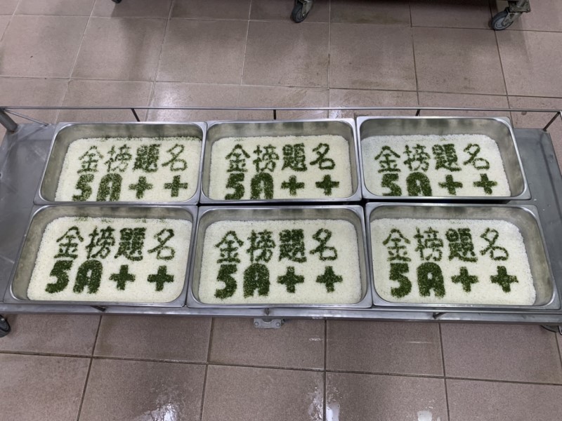 (記者魏正賜報導)路竹區一甲國中發揮創意用雷切機自製字版在國中會考前一天鍾志華校長在白飯上撒上海苔粉祝福每位會考學子們都能金榜題名5A++。