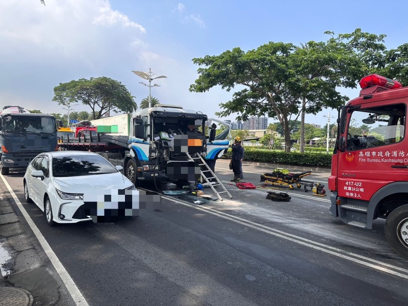 (記者李麗華報導)25日早上9點,1方車史姓駕駛(男、77年次)駕駛聯結車稱沿中山四路南向北行駛,追撞前方停等紅燈之2方車吳姓聯結車駕駛(男、54年次)、3方車陳姓駕駛(駕駛租賃小客車、男、74年次)致肇事,史姓駕駛受困車內,經消防隊到場協助已脫困,現場人員皆意識清楚,史性聯結車駕駛因腳部受傷,送小港醫院醫治,其餘人員無受傷。事故1、2、3方車駕駛皆無酒駕,詳細肇事原因尚待釐清。
