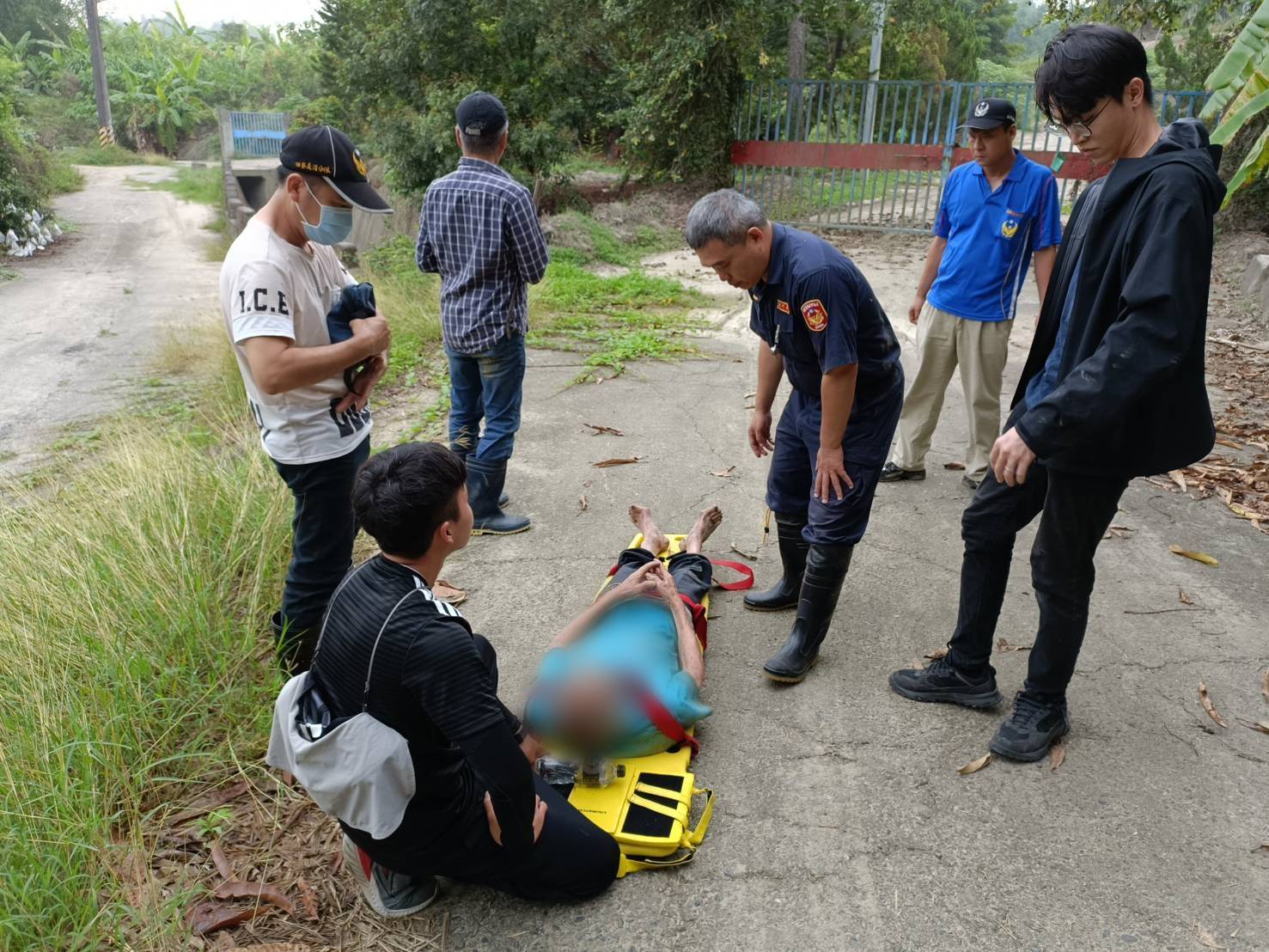 圖說:高齡87歲的林姓老翁自家中外出散步後未歸,警方於今(28)日於田寮區南安路的產業道路發現林姓老翁,並送醫檢查。(高雄市湖內警分局提供)