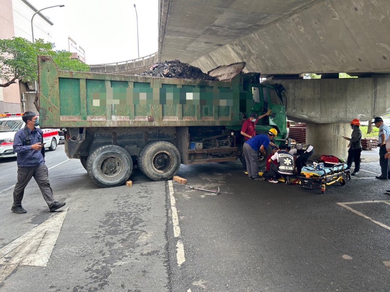 圖說:貨車剎車失靈,不慎擦撞場內前方往焚燒垃圾平台橋墩,駕駛與副駕駛受困車內,所幸送醫後無生命危險。(高雄市小港警分局提供)