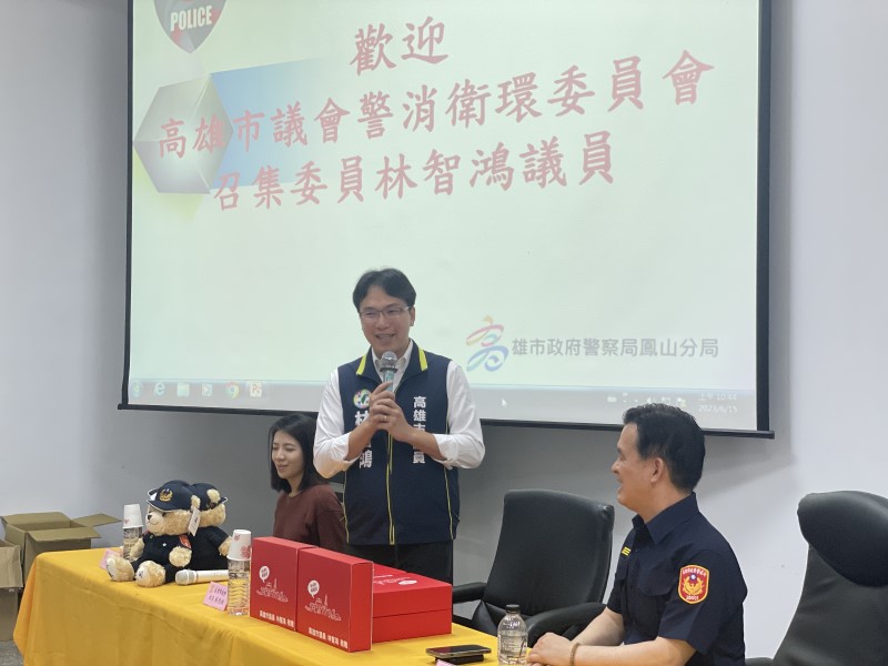 (記者李文賓報導)警察節快樂!為感謝警察同仁全天候保護市民,辛勞維護城市治安與交通,在雨季來時的安全守護,以及防阻詐騙及宣導的各項努力,市議員林智鴻擔任高雄市議會警消衛環委員會第二召集人,今(15)日上午與高熊音樂連振宇團長共同前往鳳山分局慰勞基層員警,贈送警察小熊、沐浴組、加菜金,在警察節特別的日子為警察基層同仁加油打氣,由鳳山分局蔡鴻謀分局長受贈。