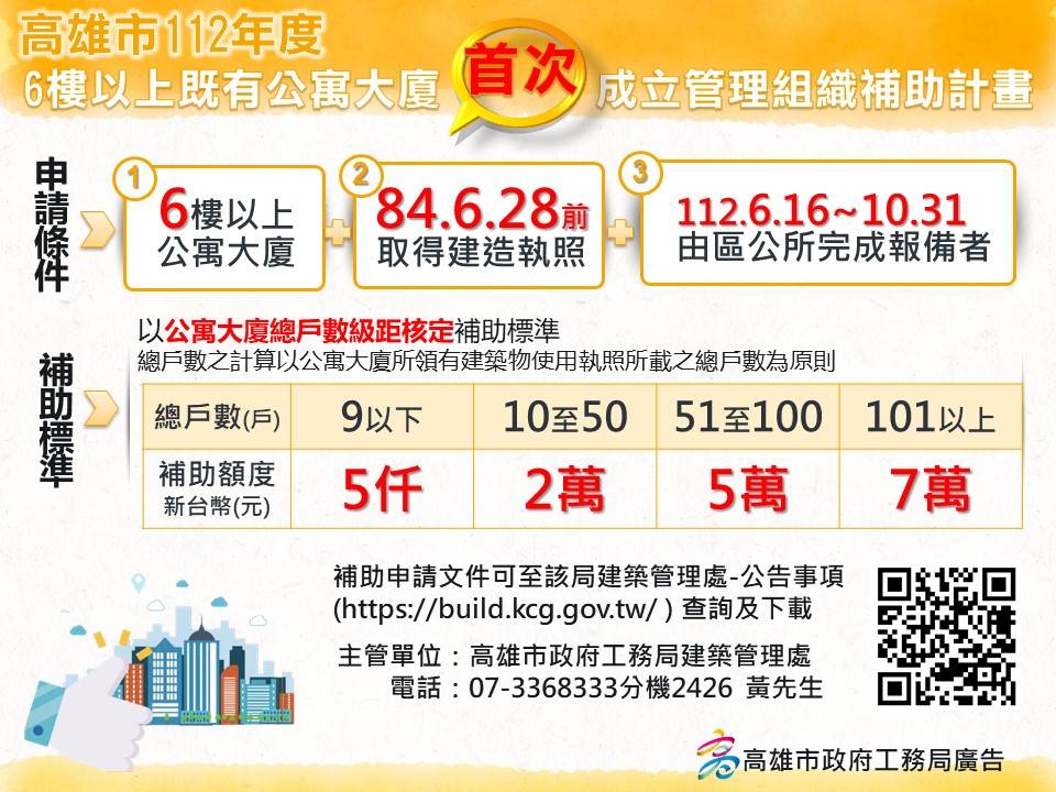 (記者吳冠賢報導)為鼓勵高雄市6樓以上既有公寓大廈成立管理組織,市府工務局於今(112)年6月16日公告補助計畫,只要是首次向區公所完成管理組織報備且完成時間在112年6月16日至10月31日止者,即可在10月31日前可向該局提出補助申請!