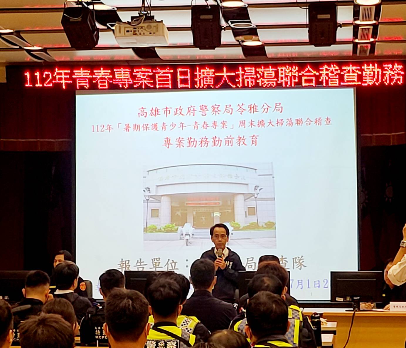 高雄市政府為強化青少年自我保護意識,高雄市政府結合所屬各機關力量,於本(30)日由高雄市政府林副市長親自率領市府教育、社會、經發、勞工、衛生、消防、工務及警察局等單位首長、人員,組成聯合稽查小組,實施青少年易聚集、滋事場所臨檢聯合稽查工作,以營造優質青少年成長環境。