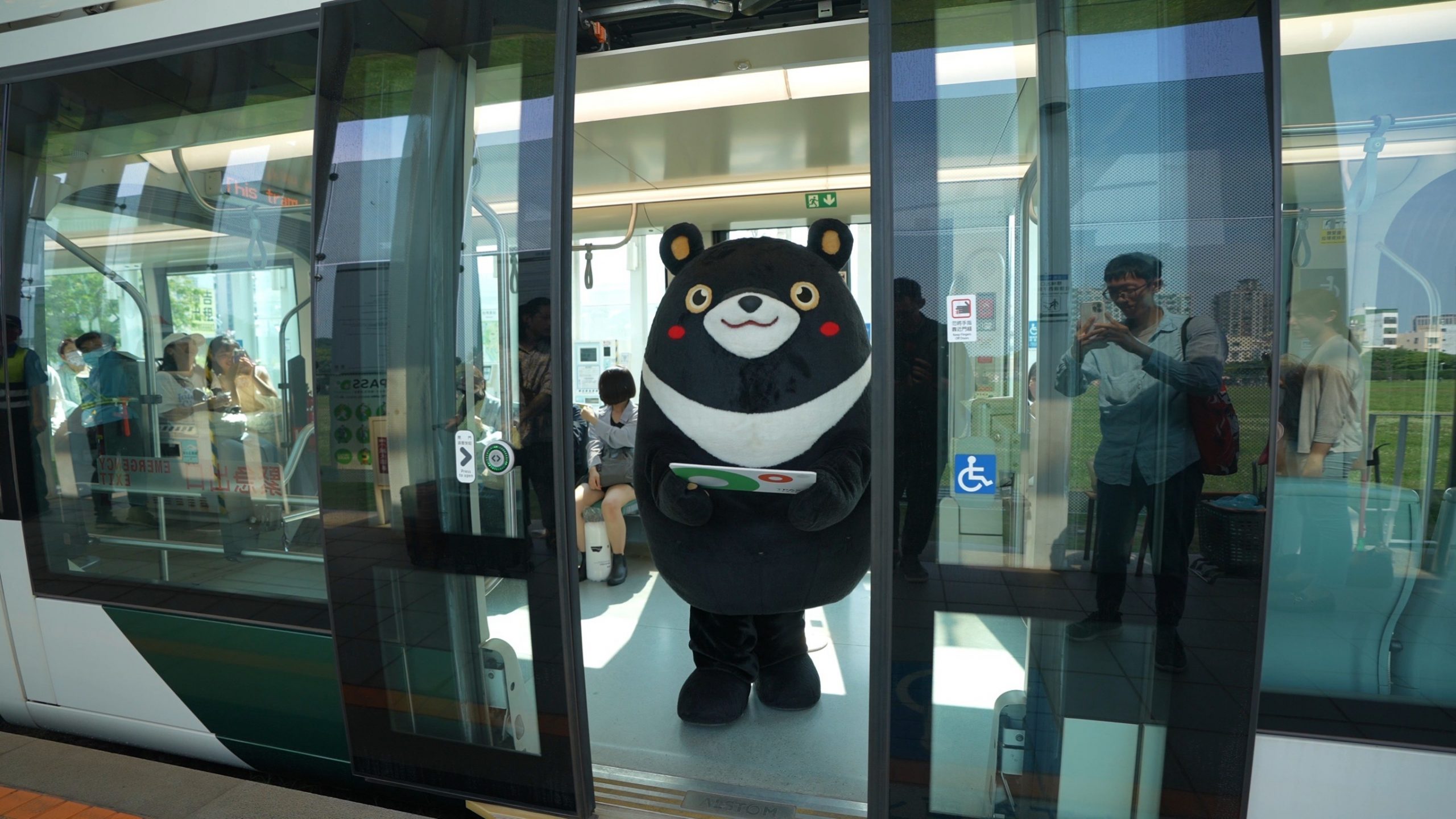 圖說:高雄市政府吉祥物「高雄熊」搭乘零碳排電動巴士到捷運西子灣站轉乘捷運。(高雄市政府提供)