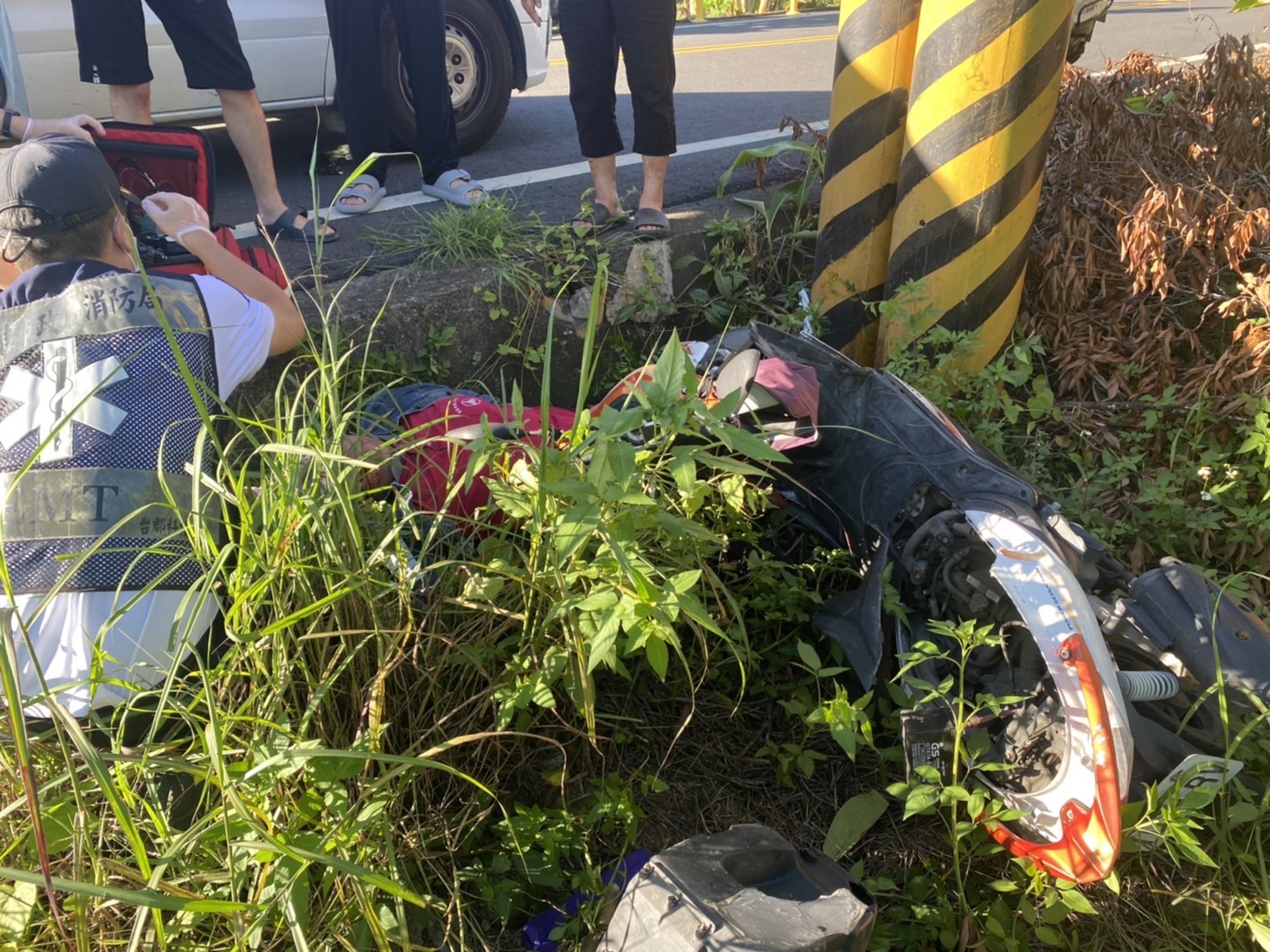 (記者張淑慧報導)旗山分局於112年7月2日16時46分在內門區金竹路(路燈編號019)接獲一起機車自撞電線桿,溝坪所員警到場查看,一名鄭姓女騎士(56年次)與機車摔落在路邊草叢,鄭女頭部額頭有外傷,有呼吸意識,緊急送往旗山醫院救治。