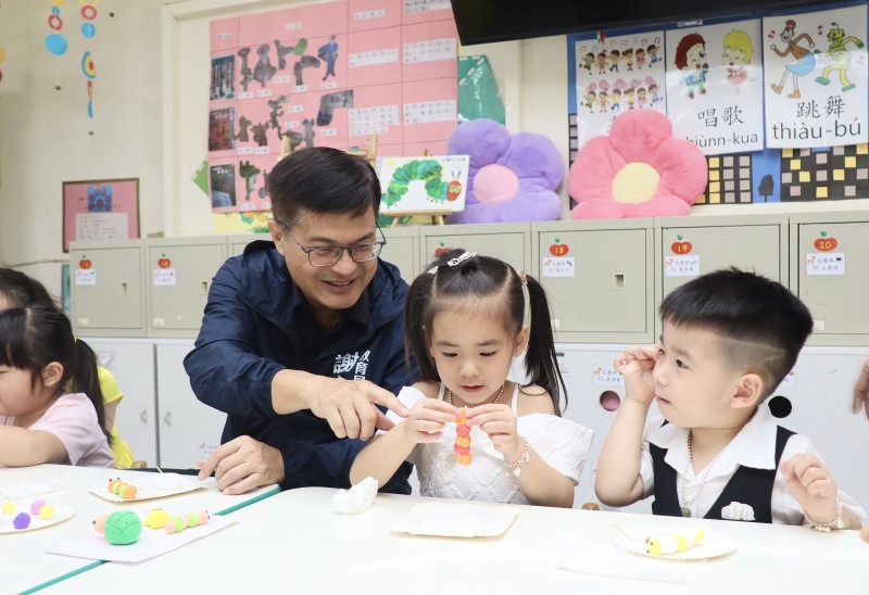 高雄7月起公立幼兒園全面實施延長照顧服務,教育局局長謝文斌今日訪視莒光國小附設幼兒園暑期延長照顧運作情形。(高雄市教育局提供)