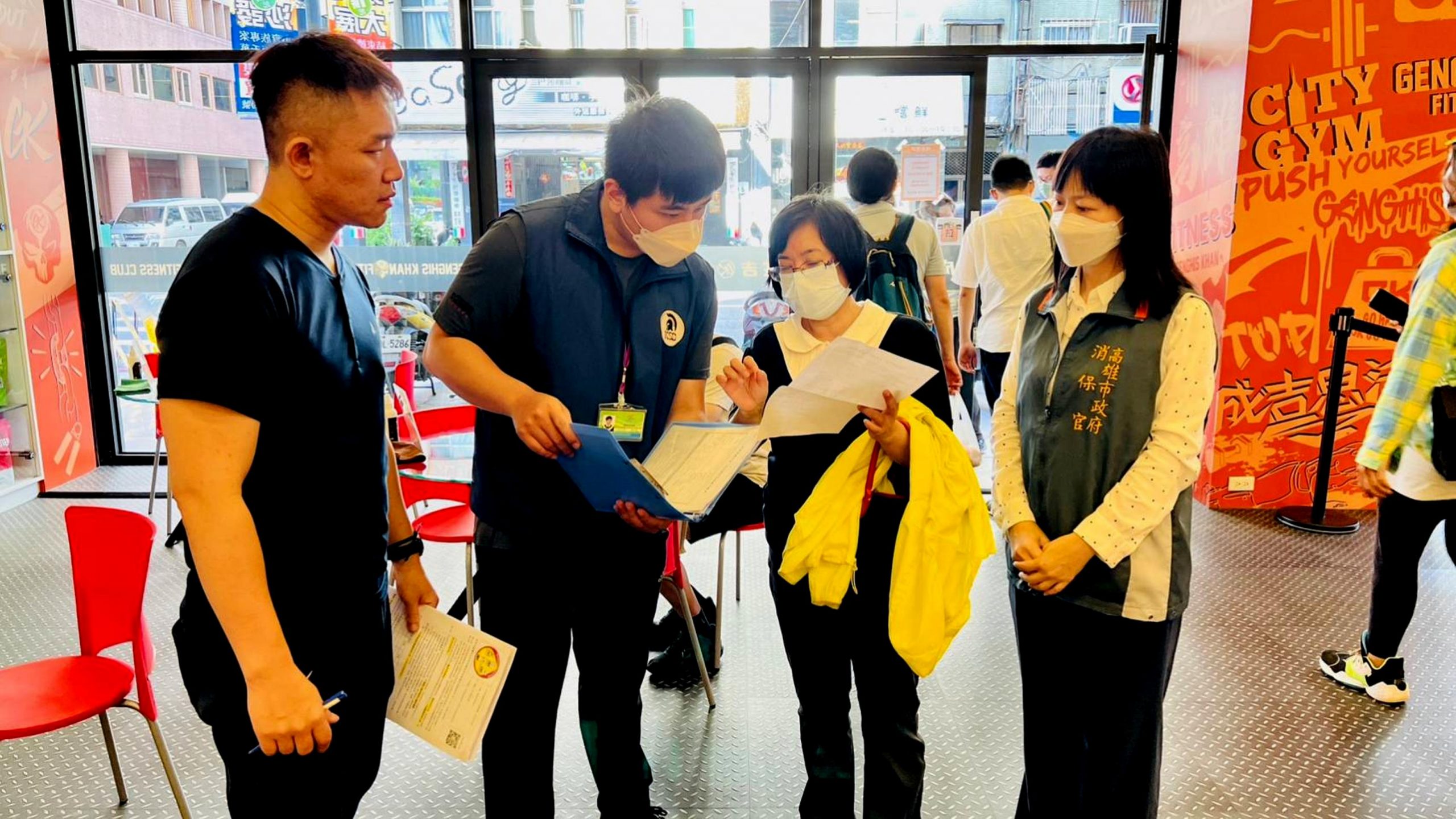 高雄市政府運發局專門委員汪小芬(右二)確認健身房器材注意事項。(運發局提供)
