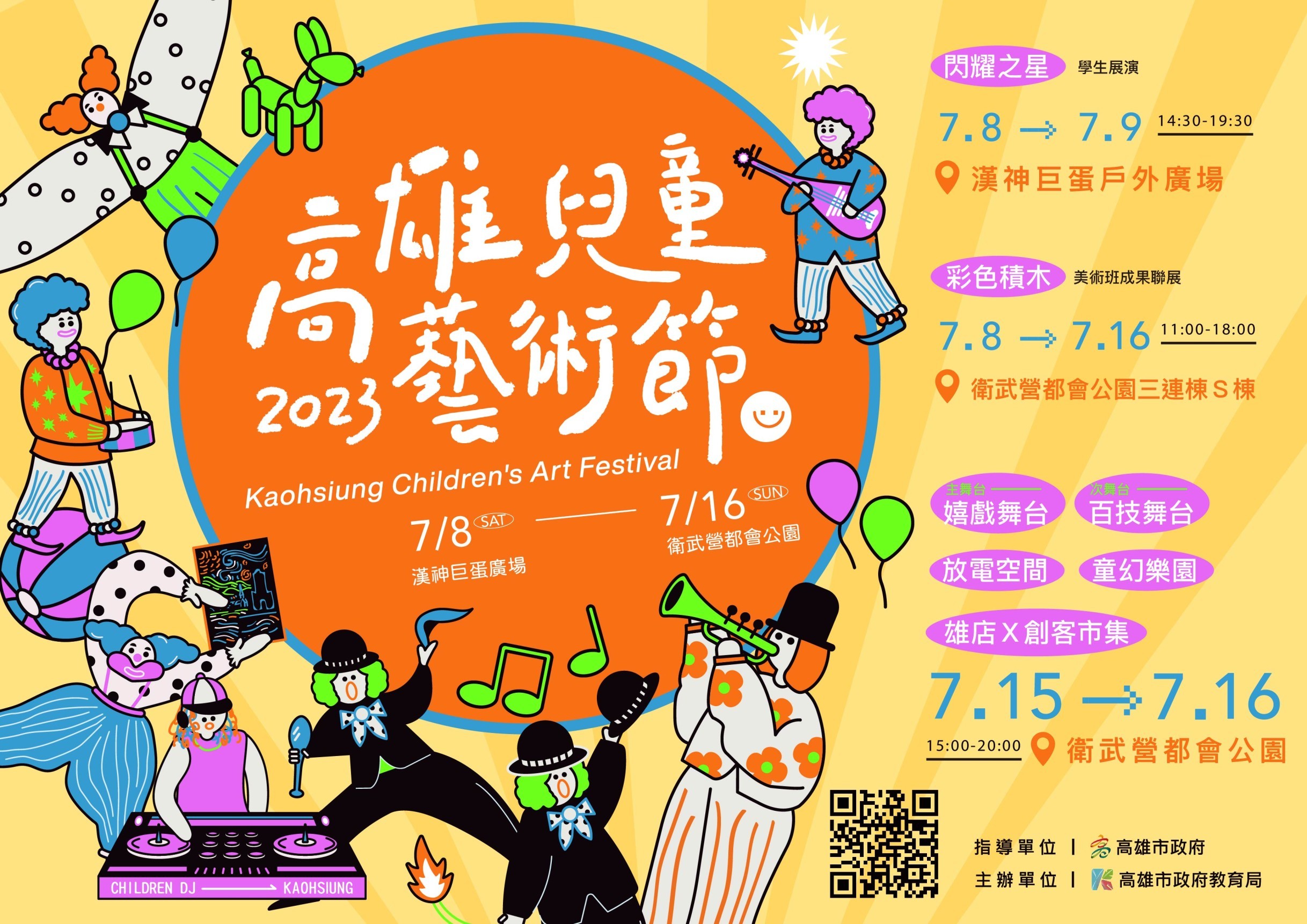 高雄兒童藝術節主活動於7月15日、7月16日於衛武營都會公園展開,邀請了國內知名的人氣團體組成豪華卡司陣容。包括台灣特技團、太日樂集、紅鼻子馬戲團、Coming True即將成真火舞團、DJ4rmstrong、蘋果劇團、Koospark Dance Studio、肆舞藝、LAD多元藝術團隊和理查馬戲表演家等,帶給大家一系列令人目眩神迷的活動,為觀眾帶來前所未見的精彩藝術饗宴。